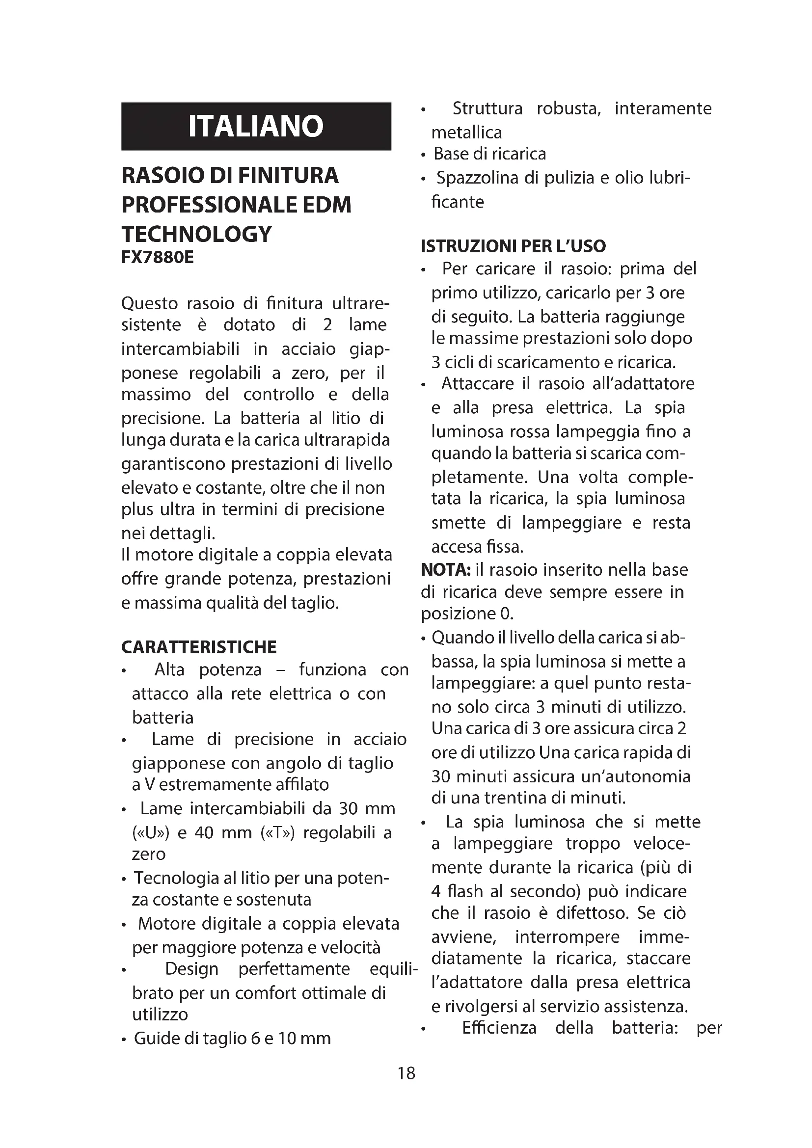 PROFESSIONALE EDM TECHNOLOGY FX7880E Questo rasoio di nitura ultrare- sistente è dotato di 2 lame intercambiabili in acciaio giap- ponese regolabili a zero, per il massimo del controllo e della precisione. La batteria al litio di lunga durata e la carica ultrarapida garantiscono prestazioni di livello elevato e costante, oltre che il non plus ultra in termini di precisione nei dettagli. Il motore digitale a coppia elevata ore grande potenza, prestazioni e massima qualità del taglio. CARATTERISTICHE