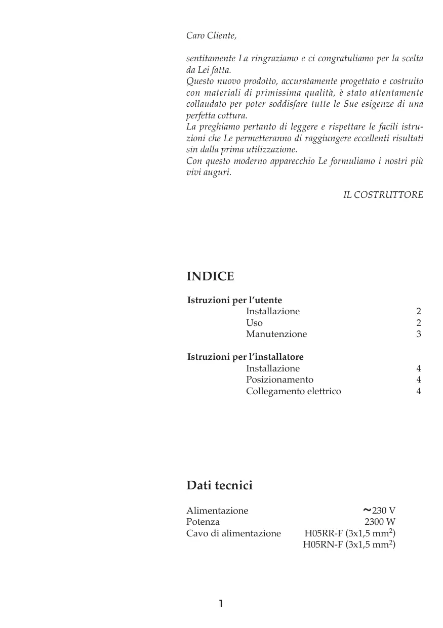 Istruzioni per l’installatore Installazione Le presenti istruzioni sono rivolte all’installatore qualificato quale guida all’installazione, regolazione e manutenzione secondo le leggi e le normative in vigore. Gli interventi devono sempre essere effettuati ad apparecchiatura disinserita elettricamente. Posizionamento (Fig. 2) L’apparecchio è previsto per essere incassato in un piano di lavoro come illustrato nell’apposita figura. Predisporre su tutto il perimetro del piano il sigillante a corredo. Collegamento elettrico Prima di effettuare l’allacciamento elettrico accertarsi che: - le caratteristiche dell’impianto siano tali da soddisfare quanto indicato sulla targa matricola applicata sul fondo del piano: - l’impianto sia munito di un efficace collegamento di terra secondo le norme e le disposizioni di legge in vigore. La messa a terra è obbligatoria a termini di legge. Nel caso che l’apparecchiatura non sia munita di cavo e/o di relativa spina utilizzare materiale idoneo per l’assorbimento indicato in targa matricola e per la temperatura di lavoro. Il cavo in nessun punto dovrà raggiungere una temperatura superiore di 50 °C a quella ambiente. Desiderando un collegamento diretto alla rete, è necessario interporre un interruttore onnipolare con apertura minima fra i contatti di 3 mm dimensionato per il carico di targa e rispondere alle norme in vigore (il cavo di terra giallo/verde non deve essere interrotto dall’interruttore). La presa o l’interruttore onnipolare devono essere facilmente raggiungibili con l’apparechiatura installata. N.B.: Il costruttore declina ogni responsabilità nel caso che quanto sopra e le usuali norme antiinfortunistiche non vengano rispettate.