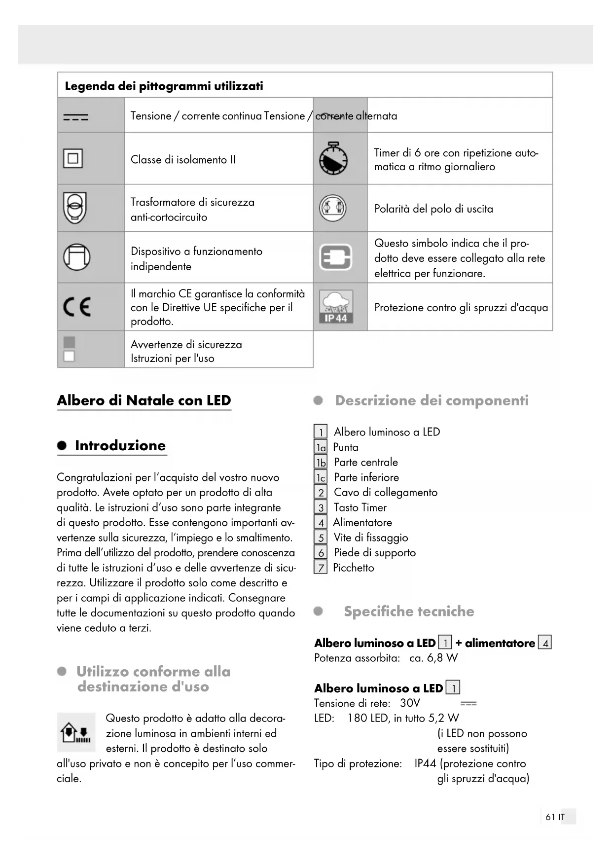 50/60Hz Tensione di esercizio secondaria: 30 V , 7,2 W Classe di isolamento: Tipo di protezione: IP44 (protezione contro gli spruzzi d'acqua) Alimentatore (modello N° GP-SW300DC0240T-IP44(EU)) con omologa- zione GS. SELV: bassissima tensione di sicurezza (safety extra low voltage) Ta: temperatura ambiente massima Tc: temperatura dell'allog- giamento nel punto indi- cato Contenuto della confezione 1 albero luminoso a LED (1 punta, 1 parte centrale, 1 parte inferiore) 1 piede di supporto 1 alimentatore 3 viti di fissaggio 2 picchetti 1 manuale di istruzioni per l'uso Avvertenze di sicurezza