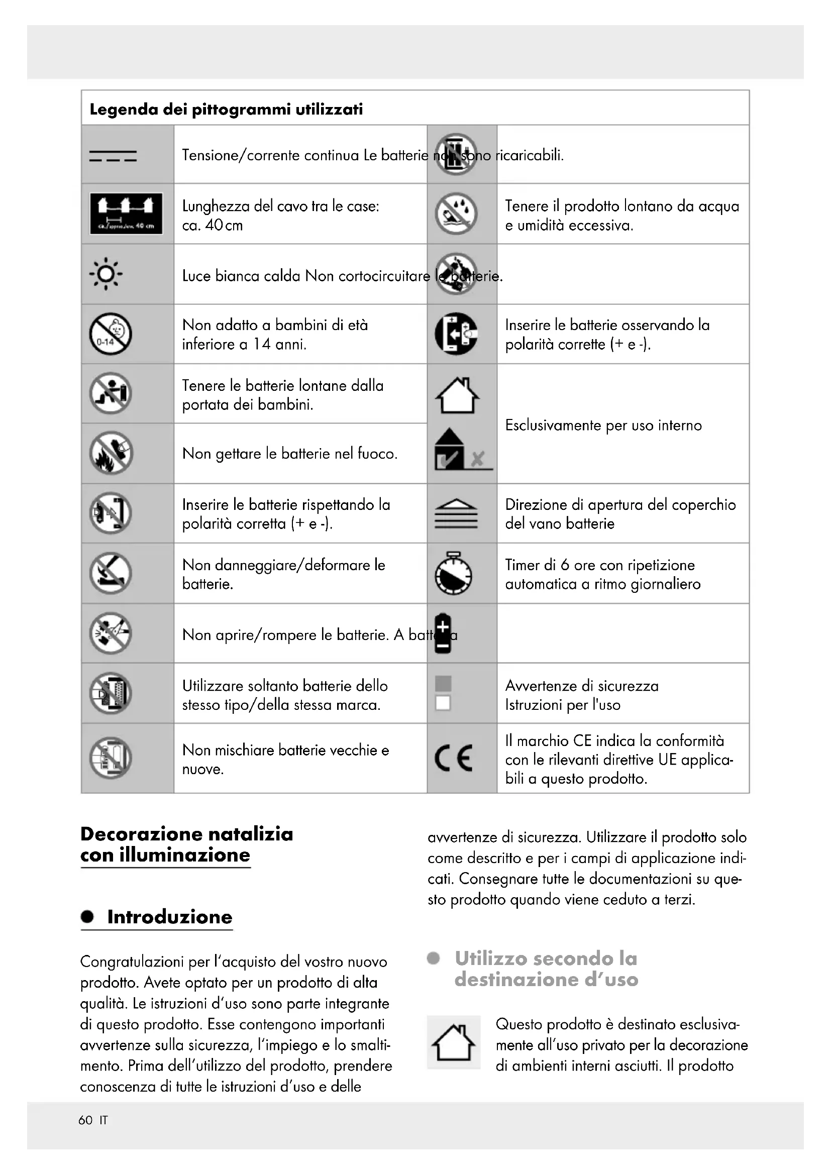 SCALDAMENTO! Non mettere in funzione il prodotto quando all‘interno della confezione. Questo prodotto non contiene componenti la cui manutenzione può essere eseguita ad opera dell‘utente. I LED non sono sostituibili. Sostituire l‘intero prodotto qualora i LED giun- gessero al termine della propria vita media. Il prodotto non può essere collegato elettrica- mente con un‘altra catena luminosa. Non collegare mai il prodotto direttamente ad un allacciamento da 230 V. Non fissare ulteriori oggetti sul prodotto. Non fissare con ganci o chiodi affilati. Avvertenze di sicurezza per batterie/accumulatori PERICOLO DI MORTE! Tenere le batterie / gli accumulatori fuori dalla portata dei bam- bini. In caso di ingerimento consultare subito un medico! L’ingerimento può provocare ustioni, perfora- zione di tessuti molli e la morte. Eventuali ustioni gravi possono comparire anche nel corso delle 2 ore successive all’ingerimento. PERICOLO DI ESPLOSIONE! Non ricaricare mai batterie non ricaricabili. Non cortocircuitare e/o aprire le batterie o gli accumulatori. Ne62 IT conseguirebbe un rischio di incendio, surri- scaldamento o scoppio. Non gettare mai le batterie/gli accumulatori nel fuoco o in acqua. Non esercitare alcuna pressione meccanica sulle batterie/sugli accumulatori. Rischio di perdita di liquido dalle batterie/dagli accumulatori Evitare condizioni e temperature estreme che possano ripercuotersi sulle batterie/sugli ac- cumulatori, quali ad esempio la vicinanza a termosifoni o l‘irraggiamento solare diretto. Evitare il contatto delle sostanze chimiche con la pelle, gli occhi e le mucose in caso di fuori- uscita del liquido dalle batterie/dagli accu- mulatori! Sciacquare subito le aree colpite con acqua pulita e consultare immediatamente un medico!