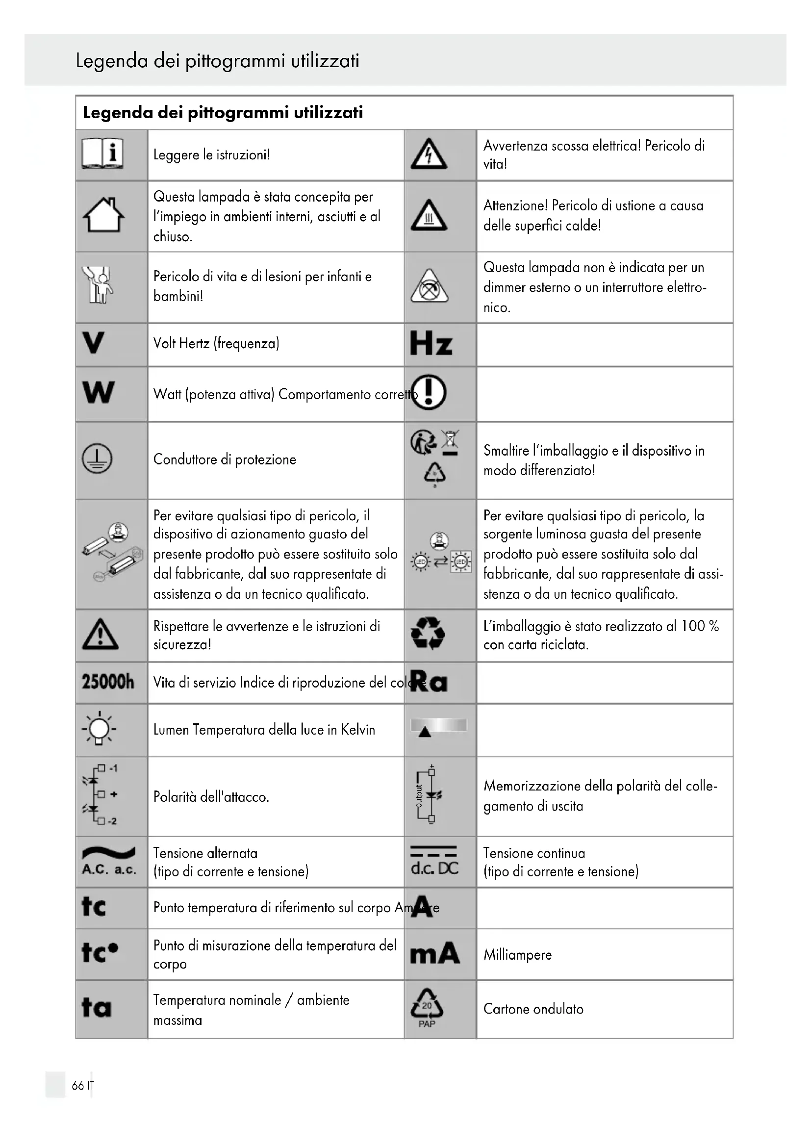 INFANTI E BAMBINI! Non permettere mai ai bambini di giocare da soli on il materiale da imballaggio. Pericolo di soffoca mento a causa del materiale da imballaggio. I IT 67 Introduzione / Sicurezzabambini sottovalutano spesso i pericoli. Tenere sempre i bambini a debita distanza dal prodotto. ■ Non lasciare mai in giro la lampada o il materiale da imballaggio. La pellicola protettiva / il sacchetto, la minuteria di plastica ecc. possono trasformarsi in giocattoli pericolosi per i bambini. ■ Questo dispositivo non può essere utilizzato da bambini in età inferiori agli 8 anni, nonché da persone con capacità fisiche, sensoriali o psichiche limitate, oppure da persone senza alcuna espe rienza e conoscenza in materia senza adeguata supervisione. Inoltre, l’uso è sempre vietato a persone che non sono state istruite sull’utilizzo sicuro del dispositivo e non conoscono i pericoli a questo correlati. I bambini non possono giocare con il dispositivo. La pulizia e la manutenzione non possono essere svolte dai bambini senza adeguata supervisione. Evitare il pericolo di vita a causa delle scosse elettriche ■ L’installazione elettrica deve essere effettuata da un elettricista o da una persona qualificata in installa zioni elettriche. ■ Prima del collegamento alla rete, verificare l’inte grità della lampada e del cavo di collegamento. Non utilizzare la lampada in caso di presidenza di danni evidenti. AVVERTENZA! Il cavo di rete danneggiato rappresenta un pericolo di vita a causa della scossa elettrica. In caso di danni, riparazioni o altri problemi alla lampada rivolgersi al servizio assistenza o a un elettricista. ■ Prima del montaggio rimuovere il fusibile o disatti vare il salvavita nella scatola dei fusibili (posizione 0). ■ Prima dell'installazione assicurarsi che la tensione di rete disponibile corrisponda alla tensione di eser cizio richiesta della lampada (vedi "Dati tecnici"). ■ Evitare sempre il contatto tra la lampada e l’acqua o altri liquidi. ■ Non aprire mai nessuna delle apparecchiature elet triche né inserire oggetti al suo interno. Tali interventi comportano pericolo di morte per scossa elettrica.