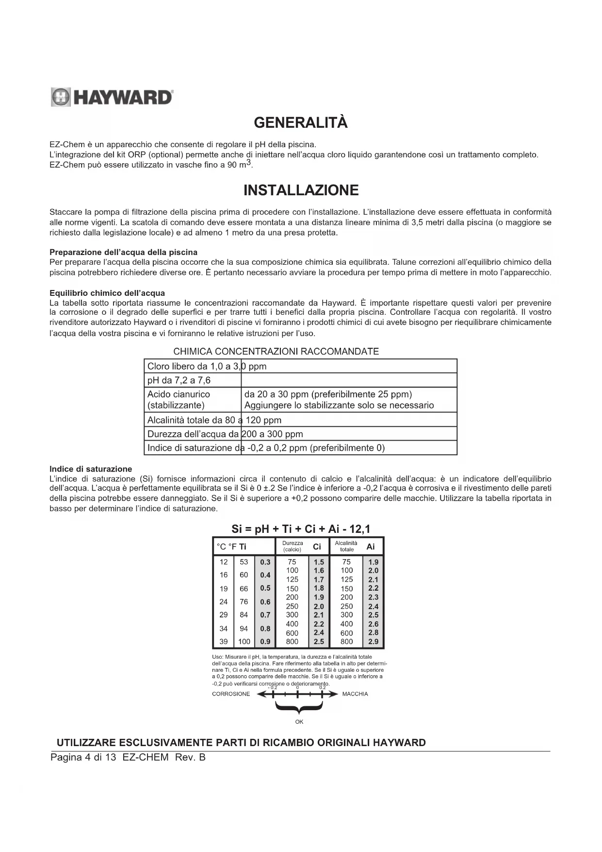 MANUALE D'USOUTILIZZARE ESCLUSIVAMENTE PARTI DI RICAMBIO ORIGINALI HAYWARD Pagina 2 di 13 EZ-CHEM Rev. B ATTENZIONE – Leggere attentamente le istruzioni contenute nel presente manuale e quelle riportate sull’apparecchio. La mancata osservanza di queste istruzioni potrebbe provocare lesioni. Il presente documento deve essere consegnato al proprietario della piscina e conservato in luogo sicuro. ATTENZIONE – I collegamenti elettrici devono essere realizzati da un elettricista qualificato autorizzato secondo le norme in vigore nel Paese di installazione.F NF C 15-100 GB BS7671:1992D DIN VDE 0100-702 EW SIST HD 384-7-702.S2A ÖVE 8001-4-702 H MSZ 2364-702:1994 / MSZ 10-533 1/1990E UNE 20460-7-702 1993, REBT ITC-BT-31 2002 M MSA HD 384-7-702.S2 IRL IS HD 384-7-702 PL TS IEC 60364-7-702