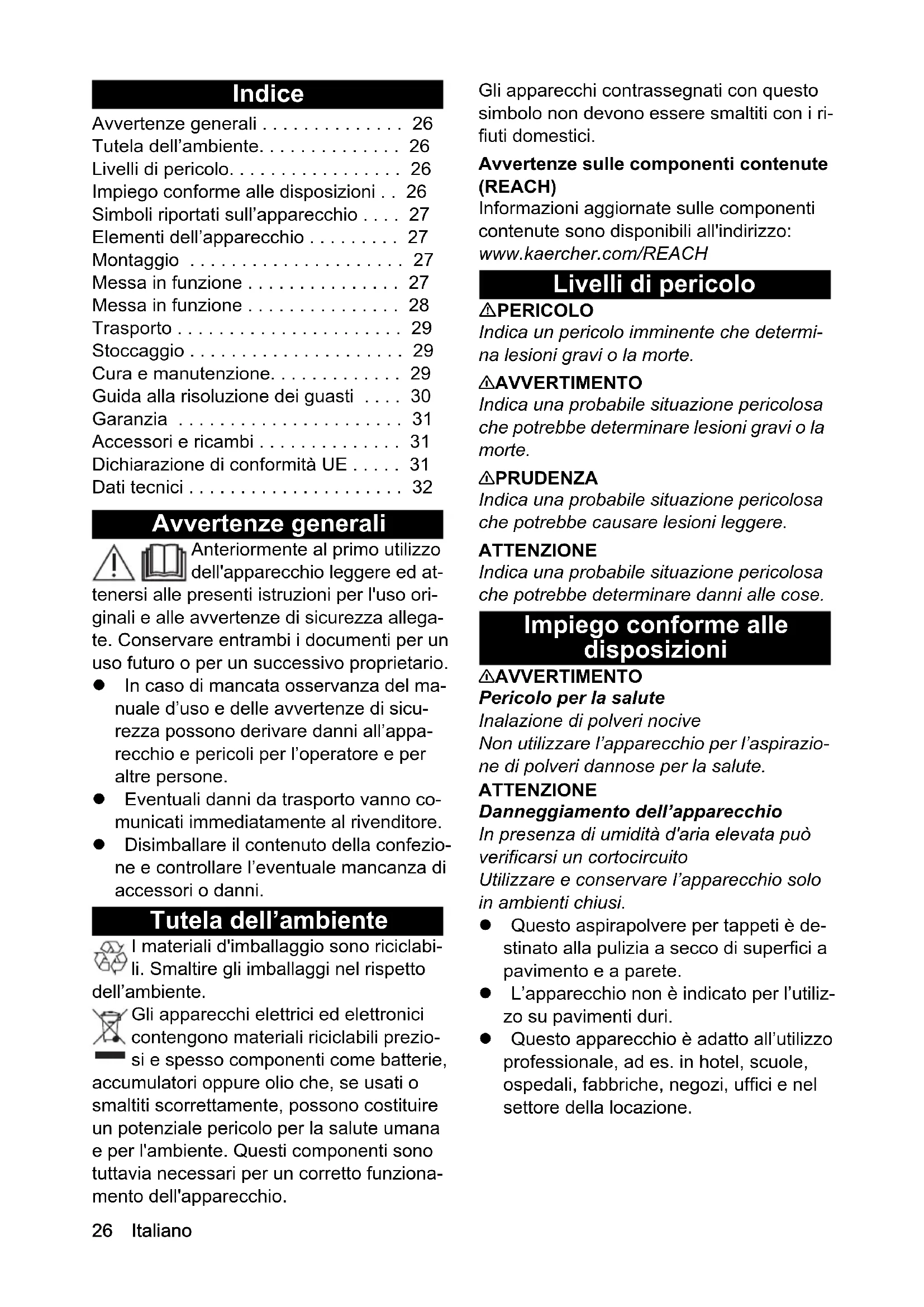 • H05VV-F 2x1,0 H05VV-F 2x1,0 Référence de pièce (EU/GB) 6.650-913.0 6.650-913.0 Longueur de câble m 0,1 0,126 Italiano Indice Avvertenze generali Anteriormente al primo utilizzo dell'apparecchio leggere ed at- tenersi alle presenti istruzioni per l'uso ori- ginali e alle avvertenze di sicurezza allega- te. Conservare entrambi i documenti per un uso futuro o per un successivo proprietario. In caso di mancata osservanza del ma- nuale d’uso e delle avvertenze di sicu- rezza possono derivare danni all’appa- recchio e pericoli per l’operatore e per altre persone. Eventuali danni da trasporto vanno co- municati immediatamente al rivenditore. Disimballare il contenuto della confezio- ne e controllare l’eventuale mancanza di accessori o danni. Tutela dell’ambiente I materiali d'imballaggio sono riciclabi- li. Smaltire gli imballaggi nel rispetto dell’ambiente. Gli apparecchi elettrici ed elettronici contengono materiali riciclabili prezio- si e spesso componenti come batterie, accumulatori oppure olio che, se usati o smaltiti scorrettamente, possono costituire un potenziale pericolo per la salute umana e per l'ambiente. Questi componenti sono tuttavia necessari per un corretto funziona- mento dell'apparecchio. Gli apparecchi contrassegnati con questo simbolo non devono essere smaltiti con i ri- fiuti domestici. Avvertenze sulle componenti contenute (REACH) Informazioni aggiornate sulle componenti contenute sono disponibili all'indirizzo: www.kaercher.com/REACH Livelli di pericolo PERICOLO Indica un pericolo imminente che determi- na lesioni gravi o la morte. 몇 AVVERTIMENTO Indica una probabile situazione pericolosa che potrebbe determinare lesioni gravi o la morte. 몇 PRUDENZA Indica una probabile situazione pericolosa che potrebbe causare lesioni leggere. ATTENZIONE Indica una probabile situazione pericolosa che potrebbe determinare danni alle cose. Impiego conforme alle disposizioni 몇 AVVERTIMENTO Pericolo per la salute Inalazione di polveri nocive Non utilizzare l’apparecchio per l’aspirazio- ne di polveri dannose per la salute. ATTENZIONE Danneggiamento dell’apparecchio In presenza di umidità d'aria elevata può verificarsi un cortocircuito Utilizzare e conservare l’apparecchio solo in ambienti chiusi. Questo aspirapolvere per tappeti è de- stinato alla pulizia a secco di superfici a pavimento e a parete. L’apparecchio non è indicato per l’utiliz- zo su pavimenti duri. Questo apparecchio è adatto all’utilizzo professionale, ad es. in hotel, scuole, ospedali, fabbriche, negozi, uffici e nel settore della locazione. Avvertenze generali p. 26