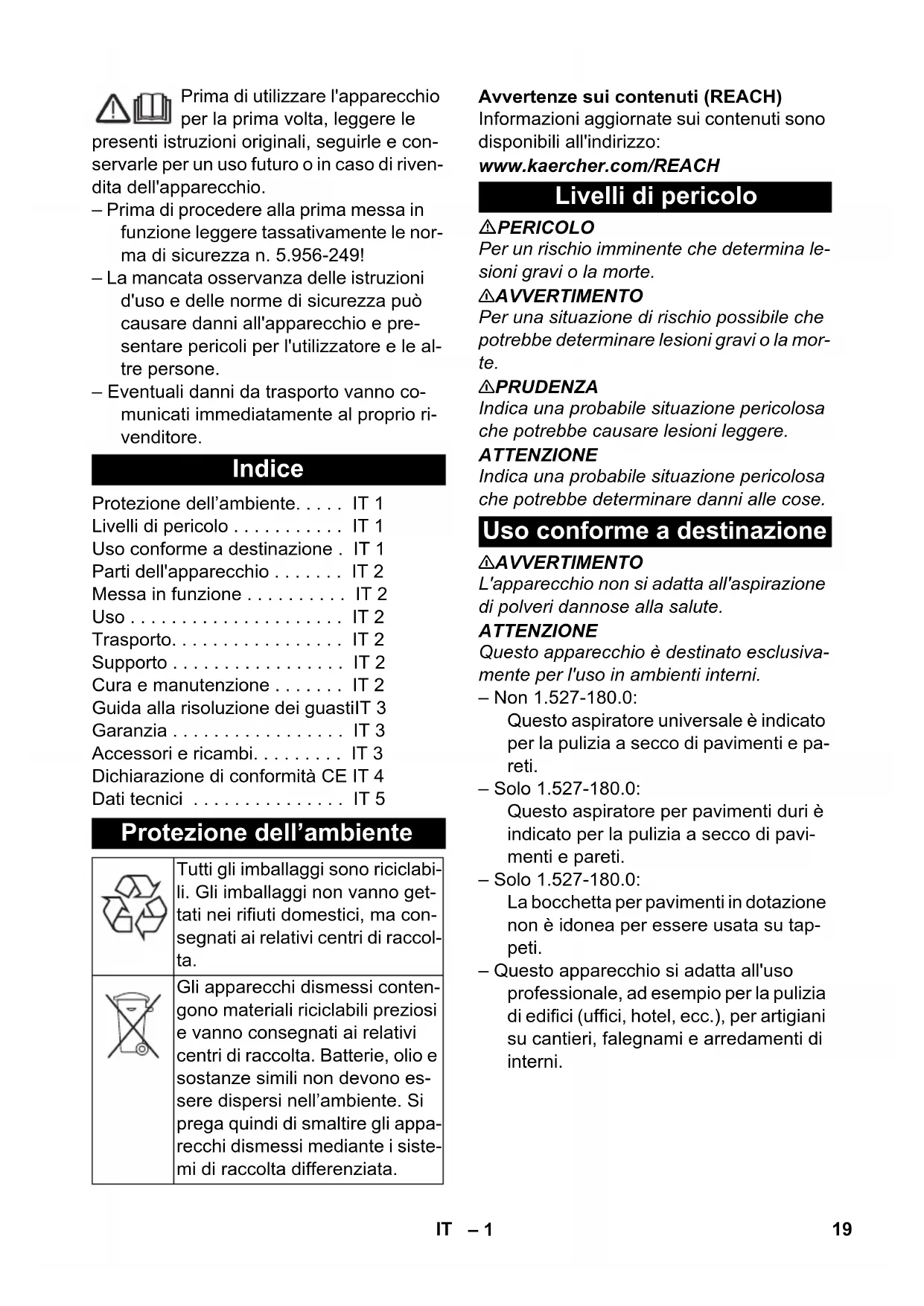 Référence Longueur de câble EU 6.650-389.0 7,5 m GB 6.650-429.0 7,5 m 18 FR– 1 Prima di utilizzare l'apparecchio per la prima volta, leggere le presenti istruzioni originali, seguirle e con- servarle per un uso futuro o in caso di riven- dita dell'apparecchio. – Prima di procedere alla prima messa in funzione leggere tassativamente le nor- ma di sicurezza n. 5.956-249! – La mancata osservanza delle istruzioni d'uso e delle norme di sicurezza può causare danni all'apparecchio e pre- sentare pericoli per l'utilizzatore e le al- tre persone. – Eventuali danni da trasporto vanno co- municati immediatamente al proprio ri- venditore. Avvertenze sui contenuti (REACH) Informazioni aggiornate sui contenuti sono disponibili all'indirizzo: www.kaercher.com/REACH PERICOLO Per un rischio imminente che determina le- sioni gravi o la morte. 몇 AVVERTIMENTO Per una situazione di rischio possibile che potrebbe determinare lesioni gravi o la mor- te. 몇 PRUDENZA Indica una probabile situazione pericolosa che potrebbe causare lesioni leggere. ATTENZIONE Indica una probabile situazione pericolosa che potrebbe determinare danni alle cose. 몇 AVVERTIMENTO L'apparecchio non si adatta all'aspirazione di polveri dannose alla salute. ATTENZIONE Questo apparecchio è destinato esclusiva- mente per l'uso in ambienti interni. – Non 1.527-180.0: Questo aspiratore universale è indicato per la pulizia a secco di pavimenti e pa- reti. – Solo 1.527-180.0: Questo aspiratore per pavimenti duri è indicato per la pulizia a secco di pavi- menti e pareti. – Solo 1.527-180.0: La bocchetta per pavimenti in dotazione non è idonea per essere usata su tap- peti. – Questo apparecchio si adatta all'uso professionale, ad esempio per la pulizia di edifici (uffici, hotel, ecc.), per artigiani su cantieri, falegnami e arredamenti di interni. Indice Protezione dell’ambiente... IT 1 Livelli di pericolo ... IT 1 Uso conforme a destinazione . IT 1 Parti dell'apparecchio ... IT 2 Messa in funzione ... IT 2 Uso ... IT 2 Trasporto... IT 2 Supporto ... IT 2 Cura e manutenzione ... IT 2 Guida alla risoluzione dei guastiIT 3 Garanzia ... IT 3 Accessori e ricambi... IT 3 Dichiarazione di conformità CE IT 4 Dati tecnici ... IT 5 Protezione dell’ambiente Tutti gli imballaggi sono riciclabi- li. Gli imballaggi non vanno get- tati nei rifiuti domestici, ma con- segnati ai relativi centri di raccol- ta. Gli apparecchi dismessi conten- gono materiali riciclabili preziosi e vanno consegnati ai relativi centri di raccolta. Batterie, olio e sostanze simili non devono es- sere dispersi nell’ambiente. Si prega quindi di smaltire gli appa- recchi dismessi mediante i siste- mi di raccolta differenziata. Livelli di pericolo Uso conforme a destinazione 19IT– 2 1 Sacchetto filtro plissettato 2 Raccordo di aspirazione 3 Tubo flessibile di aspirazione 4 Targhetta 5 Maniglia trasporto 6 Portatubo 7 Reggicavo 8 Cavo di alimentazione 9 Testa aspirante 10 Dispositivo di blocco della testa di aspi- razione 11 Ruota pivottante 12 Contenitore sporcizia 13 Interruttore principale 14 Commutatore superficie dura/tappeti (in funzione alla dotazione) 15 Bocchetta pavimenti 16 Tubo rigido di aspirazione 17 Regolatore di potenza aspirazione (continuo) (in funzione alla dotazione) 18 Gomito 19 Cesto per filtro principale 20 Filtro protezione motore 1 Funzionamento con sacchetto filtro 2 Funzionamento senza sacchetto filtro Verificare se il cesto del filtro principale sia inserito nell'apparechio. Sbloccare e staccare la testa aspirante. Rimuovere il cesto del filtro principale. Introdurre il sacchetto filtro plissettato. Inserire il cesto del filtro principale. Rimettere la testa aspirante e bloccarla. Inserire la spina di alimentazione. Attivare l'apparecchio dall'interruttore principale. Non 1.527-180.0: Impostare il commutatore della boc- chetta per pavimenti su Superficie dura o Tappeto. Solo ProT 200: Regolare la forza di aspirazione sul re- golatore di potenza aspirazione (conti- nuo). Eseguire la pulizia. Disattivare l'apparecchio dall'interrutto- re principale. Staccare la spina. Svuotare il serbatoio. Pulire l’apparecchio all’interno e all’esterno aspirando e passando la su- perficie con un panno umido. 몇 PRUDENZA Pericolo di lesioni e di danneggiamento! Ri- spettare il peso dell'apparecchio durante il trasporto. Per il trasporto in veicoli, assicurare l'apparecchio secondo le direttive in vi- gore affinché non possa scivolare e ri- baltarsi. 몇 PRUDENZA Pericolo di lesioni e di danneggiamento! Ri- spettare il peso dell'apparecchio durante la conservazione. Questo apparecchio può essere conserva- to solo in ambienti interni. PERICOLO Disattivare l'apparecchio ed estrarre la spi- na di alimentazione prima di effettuare in- terventi sull'apparecchio. Pulire il cesto del filtro principale (lava- bile) all'occorrenza sotto acqua corren- te. Parti dell'apparecchio Messa in funzione Modalità operative Montaggio del sacchetto filtro Uso Accendere l’apparecchio Modalità pulizia Spegnere l’apparecchio A lavoro ultimato Trasporto Supporto Cura e manutenzione Pulire il cesto del filtro principale 20 IT– 3 ATTENZIONE Rischio di danneggiamento. Il cesto del fil- tro principale non deve essere inserito mai bagnato. Sbloccare e staccare la testa aspirante. Rimuovere il filtro di protezione motore. inserire un nuovo filtro protezione moto- re. Rimettere la testa aspirante e bloccarla. PERICOLO Disattivare l'apparecchio ed estrarre la spi- na di alimentazione prima di effettuare in- terventi sull'apparecchio. – È scattato il termoprotettore del motore. Cambiare il sacchetto filtro a vello. Sostituire il filtro protezione motore. Verificare che tutti i componenti siano li- beri da otturazioni. Il riavvio è possibile dopo il raffreddamento della turbina del motore dopo ca. 30 minuti. Controllare la presa e il fusibile dell'ali- mentazione di corrente. Controllare il cavo e la spina di rete dell'apparecchio. Accendere l’apparecchio.