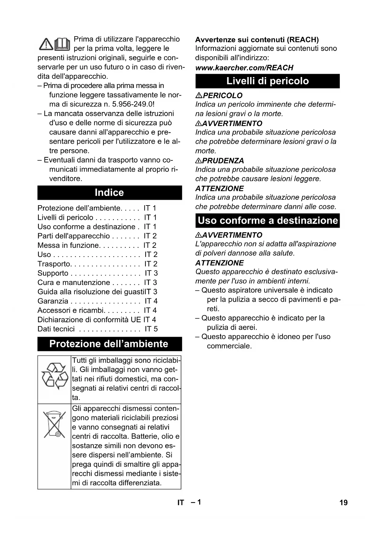 dB(A) 78 Puissance nominale absorbée W 900 Câble d’ali- mentation SJT 2x16 AWG (105 °C) Référence Longueur de câble 6.650-589.0 25 m 18 FR– 1 Prima di utilizzare l'apparecchio per la prima volta, leggere le presenti istruzioni originali, seguirle e con- servarle per un uso futuro o in caso di riven- dita dell'apparecchio. – Prima di procedere alla prima messa in funzione leggere tassativamente le nor- ma di sicurezza n. 5.956-249.0! – La mancata osservanza delle istruzioni d'uso e delle norme di sicurezza può causare danni all'apparecchio e pre- sentare pericoli per l'utilizzatore e le al- tre persone. – Eventuali danni da trasporto vanno co- municati immediatamente al proprio ri- venditore. Avvertenze sui contenuti (REACH) Informazioni aggiornate sui contenuti sono disponibili all'indirizzo: www.kaercher.com/REACH PERICOLO Indica un pericolo imminente che determi- na lesioni gravi o la morte. 몇 AVVERTIMENTO Indica una probabile situazione pericolosa che potrebbe determinare lesioni gravi o la morte. 몇 PRUDENZA Indica una probabile situazione pericolosa che potrebbe causare lesioni leggere. ATTENZIONE Indica una probabile situazione pericolosa che potrebbe determinare danni alle cose. 몇 AVVERTIMENTO L'apparecchio non si adatta all'aspirazione di polveri dannose alla salute. ATTENZIONE Questo apparecchio è destinato esclusiva- mente per l'uso in ambienti interni. – Questo aspiratore universale è indicato per la pulizia a secco di pavimenti e pa- reti. – Questo apparecchio è indicato per la pulizia di aerei. – Questo apparecchio è idoneo per l'uso commerciale. Indice Protezione dell’ambiente... IT 1 Livelli di pericolo ... IT 1 Uso conforme a destinazione . IT 1 Parti dell'apparecchio ... IT 2 Messa in funzione... IT 2 Uso ... IT 2 Trasporto... IT 2 Supporto ... IT 3 Cura e manutenzione ... IT 3 Guida alla risoluzione dei guastiIT 3 Garanzia ... IT 4 Accessori e ricambi... IT 4 Dichiarazione di conformità UE IT 4 Dati tecnici ... IT 5 Protezione dell’ambiente Tutti gli imballaggi sono riciclabi- li. Gli imballaggi non vanno get- tati nei rifiuti domestici, ma con- segnati ai relativi centri di raccol- ta. Gli apparecchi dismessi conten- gono materiali riciclabili preziosi e vanno consegnati ai relativi centri di raccolta. Batterie, olio e sostanze simili non devono es- sere dispersi nell’ambiente. Si prega quindi di smaltire gli appa- recchi dismessi mediante i siste- mi di raccolta differenziata. Livelli di pericolo Uso conforme a destinazione 19IT– 2 1 Sacchetto filtro plissettato 2 Raccordo di aspirazione 3 Tubo flessibile di aspirazione 4 Targhetta 5 Gancio per cavo 6 Maniglia trasporto 7 Cavo di alimentazione 8 Testa aspirante 9 Dispositivo di blocco della testa di aspi- razione 10 Ruota pivottante 11 Contenitore sporcizia 12 Interruttore principale 13 Commutatore superficie dura/tappeti 14 Bocchetta pavimenti 15 Tubo rigido di aspirazione 16 Fissaggio spina di rete 17 Alloggiamento bocchetta per pavimenti 18 Bloccaggio della copertura 19 Copertura 20 Regolatore di potenza aspirazione (continuo) 21 Gomito 22 Contenitore filtro 23 Filtro aria di scarico 24 Cesto per filtro principale 25 Filtro protezione motore 26 Griglia del filtro di protezione motore – Gli elementi di comando per il processo di pulizia sono gialli. – Gli elementi di comando per la manu- tenzione ed il service sono grigio chiaro. Verificare se il cesto del filtro principale sia inserito nell'apparechio. 1 Funzionamento con sacchetto filtro plis- settato o sacchetto filtro di carta (acces- sorio optional) 2 Funzionamento senza sacchetto filtro Sbloccare e staccare la testa aspirante. Rimuovere il cesto del filtro principale. Inserire il sacchetto filtro plissettato o il sacchetto di carta (accessorio optional). Inserire il cesto del filtro principale. Rimettere la testa aspirante e bloccarla. Inserire la spina di alimentazione. Attivare l'apparecchio dall'interruttore principale. Impostare il commutatore della boc- chetta per pavimenti su Superficie dura o Tappeto. Regolare la forza di aspirazione sul re- golatore di potenza aspirazione (conti- nuo). Eseguire la pulizia. Disattivare l'apparecchio dall'interrutto- re principale. Staccare la spina. Svuotare il serbatoio. Pulire l’apparecchio all’interno e all’esterno aspirando e passando la su- perficie con un panno umido. 몇 PRUDENZA Pericolo di lesioni e di danneggiamento! Ri- spettare il peso dell'apparecchio durante il trasporto. Per il trasporto in veicoli, assicurare l'apparecchio secondo le direttive in vi- gore affinché non possa scivolare e ri- baltarsi. Parti dell'apparecchio Contrassegno colore Messa in funzione Modalità operative Montaggio del sacchetto filtro Uso Accendere l’apparecchio Modalità pulizia Spegnere l’apparecchio A lavoro ultimato Trasporto 20 IT– 3 몇 PRUDENZA Pericolo di lesioni e di danneggiamento! Ri- spettare il peso dell'apparecchio durante la conservazione. Questo apparecchio può essere conserva- to solo in ambienti interni. PERICOLO Disattivare l'apparecchio ed estrarre la spi- na di alimentazione prima di effettuare in- terventi sull'apparecchio. Pulire il cesto del filtro principale (lava- bile) all'occorrenza sotto acqua corren- te. ATTENZIONE Rischio di danneggiamento. Il cesto del fil- tro principale non deve essere inserito mai bagnato. Filtro aria di scarico: Sostituire 1 volta all'anno Sbloccare e staccare la copertura. Estrarre l'alloggiamento del filtro. Estrarre filtro dell'aria de scarico de l'al- loggiamento del filtro. Inserire un nuovo filtro dell'aria de sca- rico nell'alloggiamento del filtro. Inserire l'alloggiamento del filtro. Applicare e bloccare la copertura. Sbloccare e staccare la testa aspirante. Tirare verso il basso la griglia del filtro di protezione motore, ruotare ed estrarre. Rimuovere il filtro di protezione motore. Inserire il nuovo filtro motore. Inserire ed agganciare il filtro di prote- zione motore. Rimettere la testa aspirante e bloccar