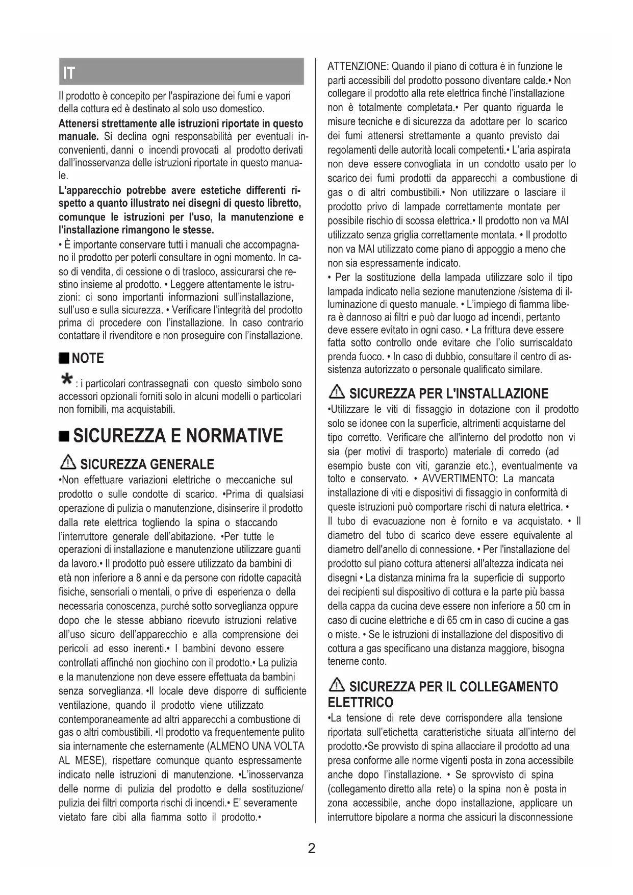 - Non effettuare variazioni elettriche o meccaniche sul prodotto o sulle condotte di scarico. •Prima di qualsiasi operazione di pulizia o manutenzione, disinserire il prodotto dalla rete elettrica togliendo la spina o staccando l’interruttore generale dell’abitazione. •Per tutte le operazioni di installazione e manutenzione utilizzare guanti da lavoro.• Il prodotto può essere utilizzato da bambini di età non inferiore a 8 anni e da persone con ridotte capacità fisiche, sensoriali o mentali, o prive di esperienza o della necessaria conoscenza, purché sotto sorveglianza oppure dopo che le stesse abbiano ricevuto istruzioni relative all’uso sicuro dell’apparecchio e alla comprensione dei pericoli ad esso inerenti.• I bambini devono essere controllati affinché non giochino con il prodotto.• La pulizia e la manutenzione non deve essere effettuata da bambini senza sorveglianza. •Il locale deve disporre di sufficiente ventilazione, quando il prodotto viene utilizzato contemporaneamente ad altri apparecchi a combustione di gas o altri combustibili. •Il prodotto va frequentemente pulito sia internamente che esternamente (ALMENO UNA VOLTA AL MESE), rispettare comunque quanto espressamente indicato nelle istruzioni di manutenzione. •L’inosservanza delle norme di pulizia del prodotto e della sostituzione/ pulizia dei filtri comporta rischi di incendi.• E’ severamente vietato fare cibi alla fiamma sotto il prodotto.• ATTENZIONE: Quando il piano di cottura è in funzione le parti accessibili del prodotto possono diventare calde.• Non collegare il prodotto alla rete elettrica finché l’installazione non è totalmente completata.• Per quanto riguarda le misure tecniche e di sicurezza da adottare per lo scarico dei fumi attenersi strettamente a quanto previsto dai regolamenti delle autorità locali competenti.• L’aria aspirata non deve essere convogliata in un condotto usato per lo scarico dei fumi prodotti da apparecchi a combustione di gas o di altri combustibili.• Non utilizzare o lasciare il prodotto privo di lampade correttamente montate per possibile rischio di scossa elettrica.• Il prodotto non va MAI utilizzato senza griglia correttamente montata. • Il prodotto non va MAI utilizzato come piano di appoggio a meno che non sia espressamente indicato.