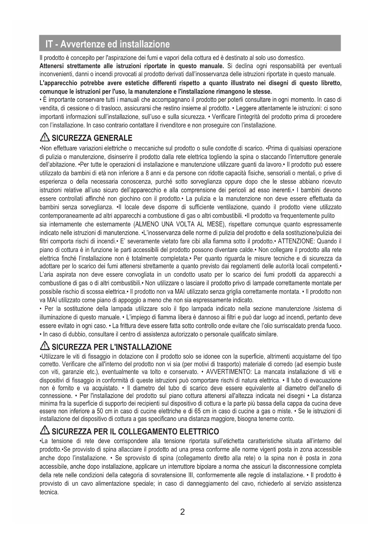 IT Avvertenze ed installazione EN Warnings and installation ES Advertencias e instalación FR Avertissements et installation PL Ostrzeżenia i instalacja CS Varování a instalace SK Varovania a inštalácia NL Waarschuwingen en installatie DE Warnungen und InstallationIT - Avvertenze ed installazione Il prodotto è concepito per l'aspirazione dei fumi e vapori della cottura ed è destinato al solo uso domestico. Attenersi strettamente alle istruzioni riportate in questo manuale. Si declina ogni responsabilità per eventuali inconvenienti, danni o incendi provocati al prodotto derivati dall’inosservanza delle istruzioni riportate in questo manuale. L'apparecchio potrebbe avere estetiche differenti rispetto a quanto illustrato nei disegni di questo libretto, comunque le istruzioni per l'uso, la manutenzione e l'installazione rimangono le stesse.