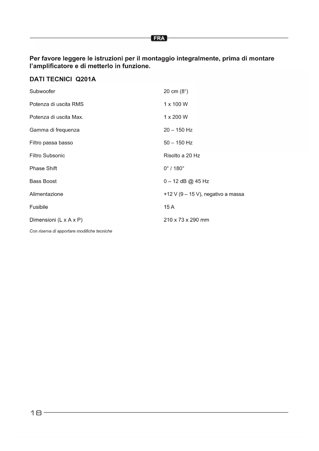Subwoofer Potenza di uscita RMS Potenza di uscita Max. Gamma di frequenza Filtro passa basso Filtro Subsonic Phase Shift Bass Boost Alimentazione Fusibile Dimensioni (L x A x P) 20 cm (8“) 1 x 100 W 1 x 200 W 20 – 150 Hz 50 – 150 Hz Risolto a 20 Hz 0° / 180° 0 – 12 dB @ 45 Hz +12 V (9 – 15 V), negativo a massa 15 A 210 x 73 x 290 mm19
