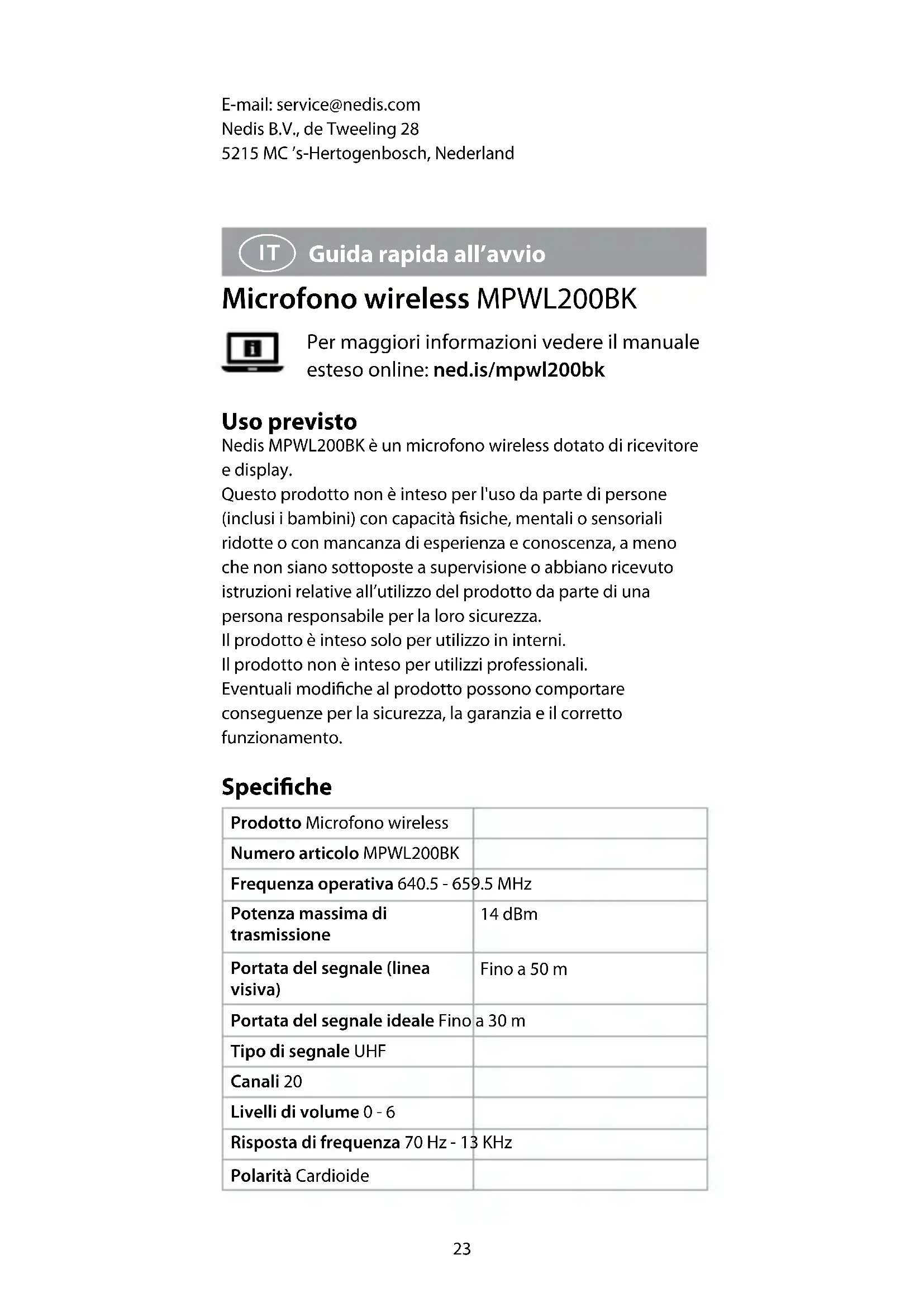 Guida rapida all’avvio Microfono wireless MPWL200BK Per maggiori informazioni vedere il manuale esteso online: ned.is/mpwl200bk Uso previsto Nedis MPWL200BK è un microfono wireless dotato di ricevitore e display. Questo prodotto non è inteso per l'uso da parte di persone (inclusi i bambini) con capacità siche, mentali o sensoriali ridotte o con mancanza di esperienza e conoscenza, a meno che non siano sottoposte a supervisione o abbiano ricevuto istruzioni relative all’utilizzo del prodotto da parte di una persona responsabile per la loro sicurezza. Il prodotto è inteso solo per utilizzo in interni. Il prodotto non è inteso per utilizzi professionali. Eventuali modiche al prodotto possono comportare conseguenze per la sicurezza, la garanzia e il corretto funzionamento. Speciche Prodotto Microfono wireless Numero articolo MPWL200BK Frequenza operativa 640.5 - 659.5 MHz Potenza massima di trasmissione 14 dBm Portata del segnale (linea visiva) Fino a 50 m Portata del segnale ideale Fino a 30 m Tipo di segnale UHF Canali 20 Livelli di volume 0 - 6 Risposta di frequenza 70 Hz - 13 KHz Polarità Cardioide24 Sensibilità -95 dB Impedenza 1000 Ω Tempo di riproduzione max con la batteria (al 50% del volume) Fino a 10 ore Interruttore di accensione/ spegnimento