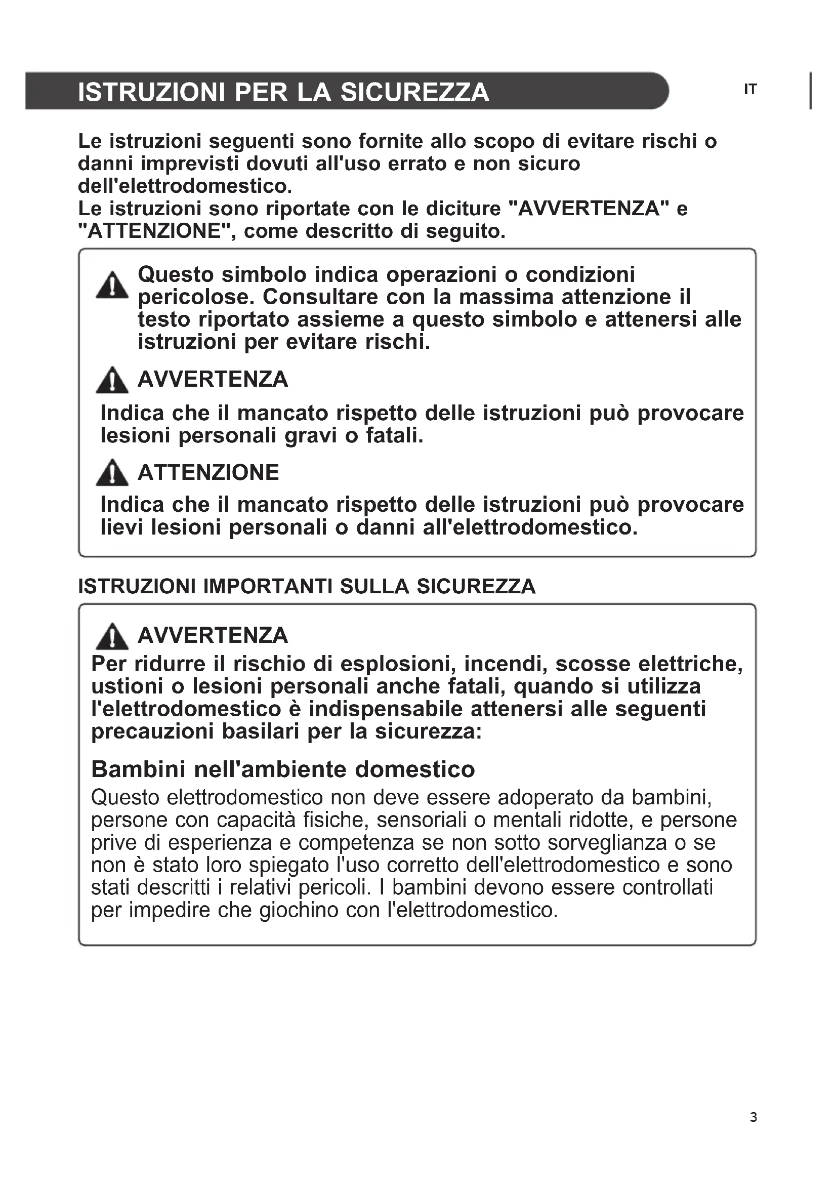 AVVERTENZA Per ridurre il rischio di esplosioni, incendi, scosse elettriche, ustioni o lesioni personali anche fatali, quando si utilizza l'elettrodomestico è indispensabile attenersi alle seguenti precauzioni basilari per la sicurezza: Bambini nell'ambiente domestico Questo elettrodomestico non deve essere adoperato da bambini, persone con capacità fisiche, sensoriali o mentali ridotte, e persone prive di esperienza e competenza se non sotto sorveglianza o se non è stato loro spiegato l'uso corretto dell'elettrodomestico e sono stati descritti i relativi pericoli. I bambini devono essere controllati per impedire che giochino con l'elettrodomestico.4