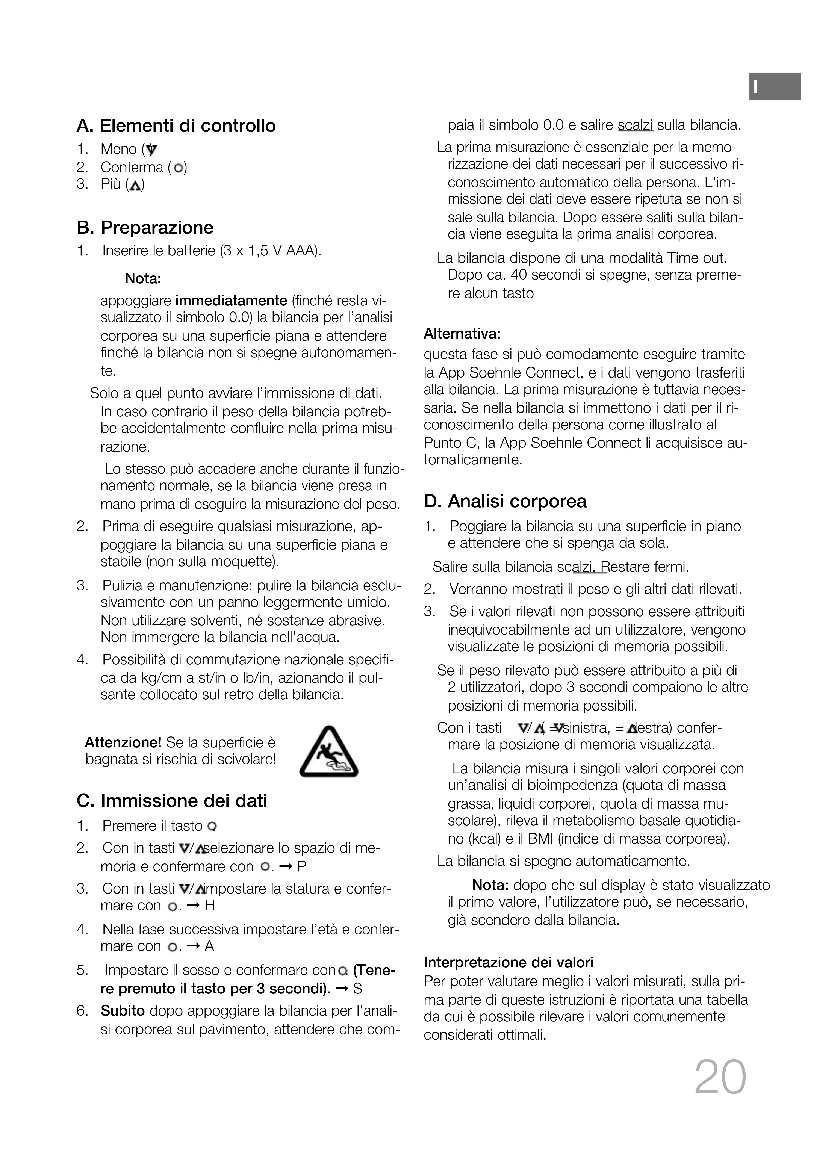 cia viene eseguita la prima analisi corporea. La bilancia dispone di una modalità Time out. Dopo ca. 40 secondi si spegne, senza preme- re alcun tasto Alternativa: questa fase si può comodamente eseguire tramite la App Soehnle Connect, e i dati vengono trasferiti alla bilancia. La prima misurazione è tuttavia neces- saria. Se nella bilancia si immettono i dati per il ri- conoscimento della persona come illustrato al Punto C, la App Soehnle Connect li acquisisce au- tomaticamente. D. Analisi corporea
