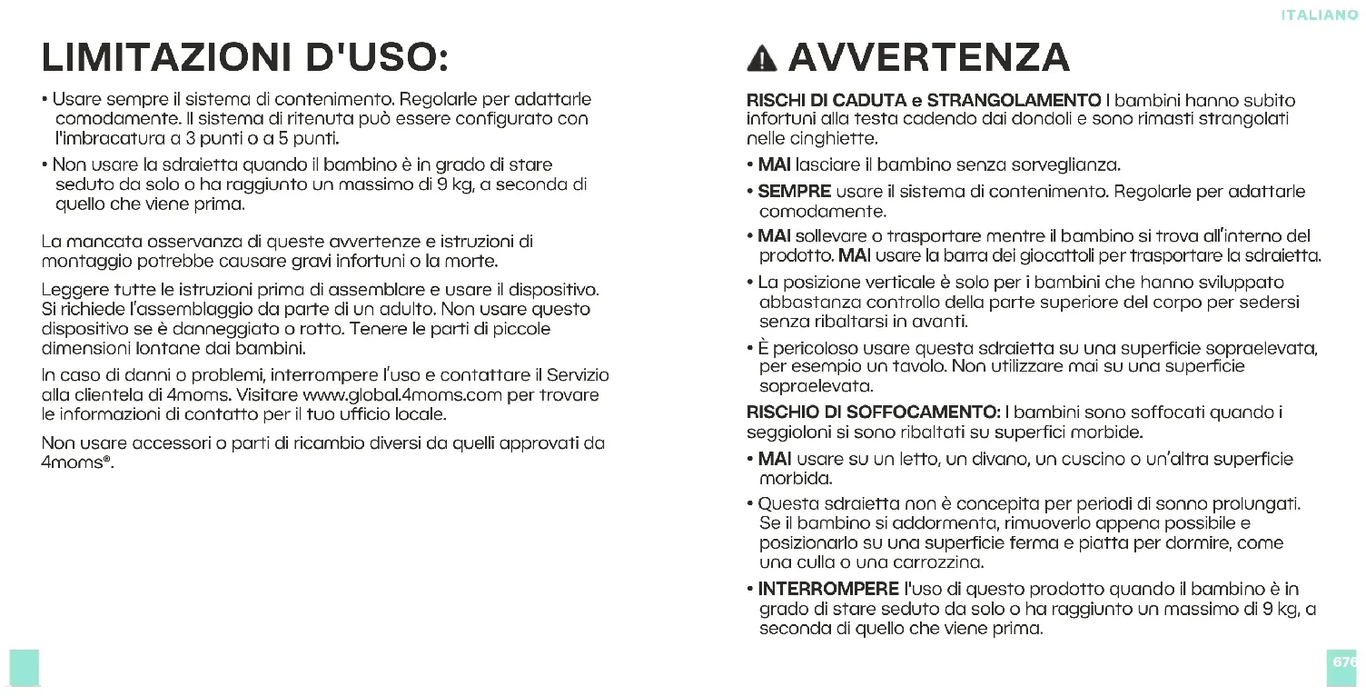 - Non usare la sdraietta quando il bambino è in grado di stare seduto da solo o ha raggiunto un massimo di 9 kg, a seconda di quello che viene prima. La mancata osservanza di queste avvertenze e istruzioni di montaggio potrebbe causare gravi infortuni o la morte. Leggere tutte le istruzioni prima di assemblare e usare il dispositivo. Si richiede l’assemblaggio da parte di un adulto. Non usare questo dispositivo se è danneggiato o rotto. Tenere le parti di piccole dimensioni lontane dai bambini. In caso di danni o problemi, interrompere l’uso e contattare il Servizio alla clientela di 4moms. Visitare www.global.4moms.com per trovare le informazioni di contatto per il tuo ufficio locale. Non usare accessori o parti di ricambio diversi da quelli approvati da 4moms®. AVVERTENZA RISCHI DI CADUTA e STRANGOLAMENTO I bambini hanno subito infortuni alla testa cadendo dai dondoli e sono rimasti strangolati nelle cinghiette.