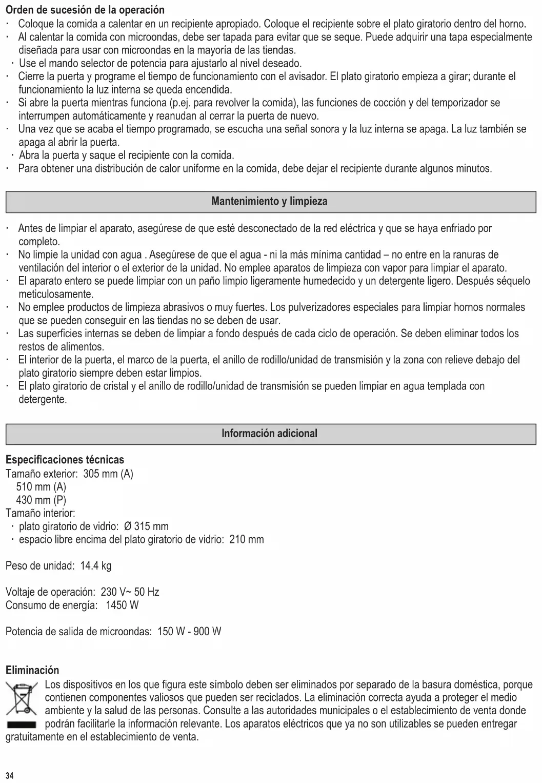 Timer ∙ Il timer prevede due scale di misurazione. La scala più esterna serve per decongelare in base al peso in kilogrammi. La scala più interna si utilizza per impostare i tempi di cottura o di riscaldamento delle vivande. ∙ La funzione timer consente di scegliere un tempo di funzionamento no a 35 minuti. ∙ Se il tempo di cottura regolato è inferiore a 5 minuti (o è per una quantità inferiore a 350 gr.), occorrerà ruotare anzitutto il pulsante verso un valore superiore poi ruotare lo stesso lentamente in senso antiorario no a raggiungere la regolazione richiesta. ∙ Una volta regolato il timer, il funzionamento verrà automaticamente avviato non appena richiuderete lo sportello. ∙ L’apparecchio potrà essere spento in qualsiasi momento riportando il timer sulla posizione ‘0’. ∙ Per scongelare, impostate il selettore di potenza sulla posizione “Scongelamento”. Impostate il timer secondo il peso dell’alimento da scongelare basandovi sulla scala di misurazione più esterna. I valori di regolazione per scongelare sono solo approssimativi e possono differire da quelli effettivamente necessari. Se allo scadere del tempo impostato, il processo di decongelamento non è completo, ripetete l’operazione con un’impostazione di tempo relativamente inferiore.40 142 x 208 mm Sequenza di funzionamento ∙ Ponete il cibo da riscaldare in un contenitore idoneo. Ponete il contenitore sopra alla piastra girevole del forno. ∙ Il cibo trattato alle microonde dovrebbe essere coperto per non farlo asciugare. Coperchi in vetro o in plastica specici per l’uso con gli apparecchi a microonde sono disponibili presso quasi tutti i negozi di articoli da cucina. ∙ Regolate il livello di potenza richiesto per mezzo dell’apposito selettore . ∙ Chiudete lo sportello e regolate il tempo di funzionamento per mezzo del timer. La piastra girevole comincerà a ruotare; la luce interna rimarrà accesa durante il funzionamento. ∙ Nel caso in cui si apra lo sportello durante il funzionamento (per mescolare il cibo, ad esempio), le funzioni cottura e timer verranno automaticamente interrotte e riprenderanno automaticamente non appena richiuderete lo sportello. ∙ Non appena sarà trascorso il tempo prestabilito, si sentirà un segnale sonoro e la luce interna si spegnerà. La luce interna si spegne anche quando aprite lo sportello. ∙ Aprite lo sportello e togliete il contenitore con il cibo. ∙ Per ottenere una distribuzione uniforme del calore all’interno del cibo, occorrerà lasciare riposare il contenitore per parecchi minuti. Manutenzione e pulizia ∙ Prima di procedere alla pulizia dell’apparecchio, assicuratevi che l’apparecchio sia disinserito dalla presa di corrente e si sia completamente raffreddato. ∙ Non pulite l’apparecchio con acqua. Impedite che dell’acqua (sia pur in minima quantità) penetri nelle fenditure di aerazione collocate sulle pareti interne o esterne dell’apparecchio. È decisamente sconsigliato l’uso di apparecchi di pulizia a vapore per pulire questo forno. ∙ L’intero apparecchio va pulito con un panno non lanuginoso leggermente umido e con un detersivo casalingo delicato. In seguito asciugatelo accuratamente. ∙ Non usate soluzioni abrasive o detergenti concentrati. Non utilizzate prodotti spray per la pulizia dei forni convenzionali disponibili sul mercato. ∙ Le pareti interne devono essere accuratamente pulite dopo ogni ciclo di funzionamento. Eliminate ogni residuo di cibo. ∙ La parte interna dello sportello, il telaio dello sportello, l’anello di rotazione/elemento di trasmissione e la zona della scanalatura guida sotto la piastra girevole di vetro devono essere tenuti sempre puliti. ∙ La piastra girevole e l’anello di rotazione/elemento di trasmissione possono essere lavati con acqua calda e detersivo. Informazioni aggiuntive Scheda tecnica Dimensioni esterne: 305 mm (H) 510 mm (W) 430 mm (D) Dimensioni interne: ∙ piastra girevole in vetro: Ø 315 mm ∙ spazio libero sopra alla piastra girevole in vetro: 210 mm Peso dell’apparecchio: 14,4 chili Tensione d’esercizio: 230 V~ 50 Hz Consumo d’energia: 1450 W Uscita microonde: 150 W - 900 W Smaltimento Gli apparecchi contrassegnati con questo simbolo devono essere smaltiti separatamente dai normali riuti domestici perché contengono materiali di valore che possono essere riciclati. Lo smaltimento adeguato protegge l’ambiente e la salute umana. Le autorità locali o il negoziante di riferimento possono fornire ulteriori informazioni in materia.41 142 x 208 mm Mikrobølgeovn & grill Kære kunde, Læs venligst denne brugsanvisning omhyggeligt inden mikrobølgeovnen tages i brug og gem denne brugsanvisning til senere reference. Ovnen bør kun benyttes af personer der er bekendt med denne vejledning. Mikrobølgeovnens dele