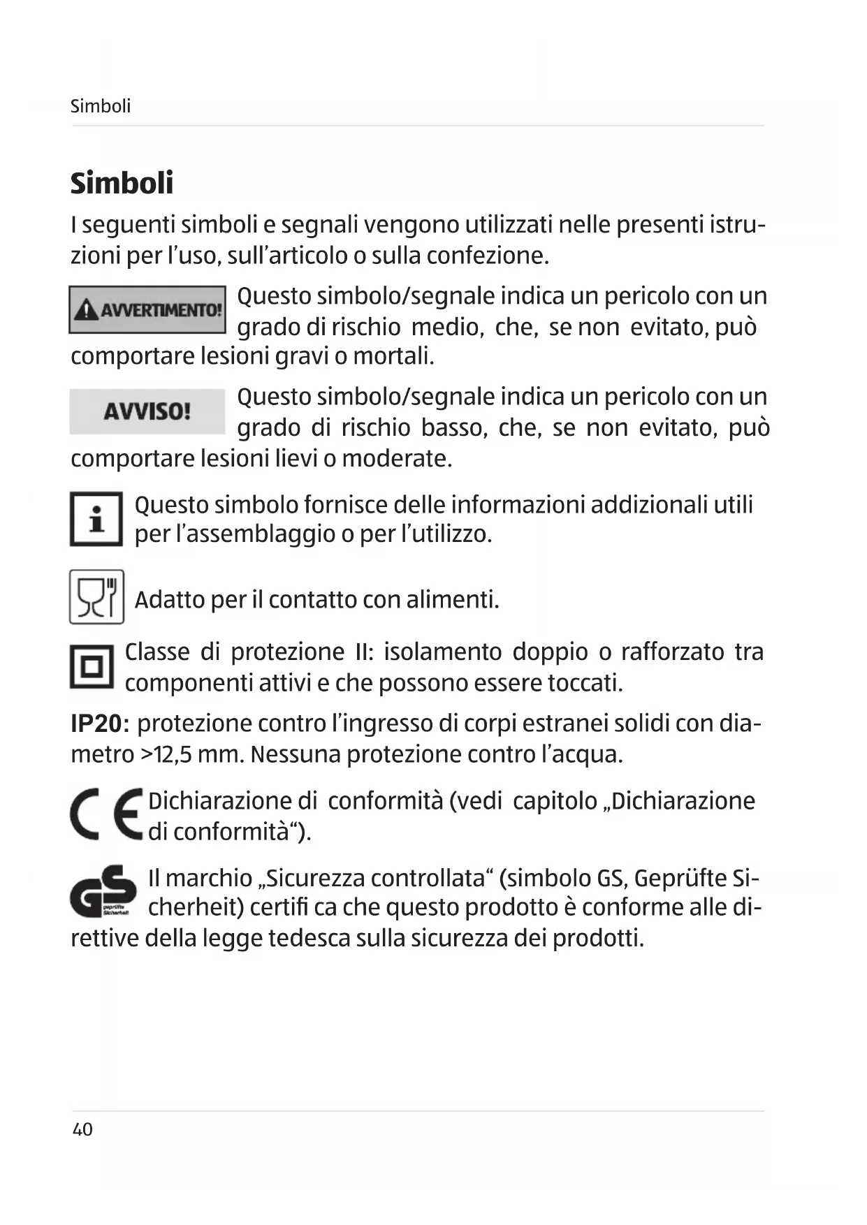 - Arrivare all’obiettivo in modo veloce e semplice grazie ai codici QR Simboli I seguenti simboli e segnali vengono utilizzati nelle presenti istru- zioni per l’uso, sull’articolo o sulla confezione. Questo simbolo/segnale indica un pericolo con un grado di rischio medio, che, se non evitato, può comportare lesioni gravi o mortali. Questo simbolo/segnale indica un pericolo con un grado di rischio basso, che, se non evitato, può comportare lesioni lievi o moderate. Questo simbolo fornisce delle informazioni addizionali utili per l’assemblaggio o per l’utilizzo. Adatto per il contatto con alimenti. Classe di protezione II: isolamento doppio o rafforzato tra componenti attivi e che possono essere toccati. IP20: protezione contro l’ingresso di corpi estranei solidi con dia- metro >12,5 mm. Nessuna protezione contro l’acqua. Dichiarazione di conformità (vedi capitolo „Dichiarazione di conformità“). Il marchio „Sicurezza controllata“ (simbolo GS, Geprüfte Si- cherheit) certifi ca che questo prodotto è conforme alle di- rettive della legge tedesca sulla sicurezza dei prodotti. Simboli41 Generalità Leggere e conservare le istruzioni per l’uso Le presenti istruzioni contengono informazioni impor- tanti sulla messa in funzione e sull’impiego. Leggere accuratamente le istruzioni all’uso, in particolare le indi- cazioni di sicurezza, prima di utilizzare il prodotto. Il mancato ri- spetto delle presenti istruzioni all’uso può comportare danni alle persone o all’articolo. Conservare le presenti istruzioni all’uso per un utilizzo successivo. Se l’articolo viene consegnato a terzi, è obbligatorio consegnare anche le presenti istruzioni per l’uso. Generalità42 Sicurezza Utilizzo conforme L’apparecchio è adatto all’estrazione di succhi da agrumi in quan- tità consuete in ambito domestico. L’apparecchio è destinato esclusivamente all’utilizzo privato. Uti- lizzare l’apparecchio esclusivamente come descritto nelle presen- ti istruzioni per l’uso. Qualsiasi altro utilizzo non è considerato conforme alle disposizio- ni e può provocare danni materiali o alle persone. Il produttore o rivenditore non si assume alcuna responsabilità per danni dovuti all’uso non conforme o scorretto. Il prodotto non è adatto per un utilizzo commerciale, ad esempio: p. 5540
