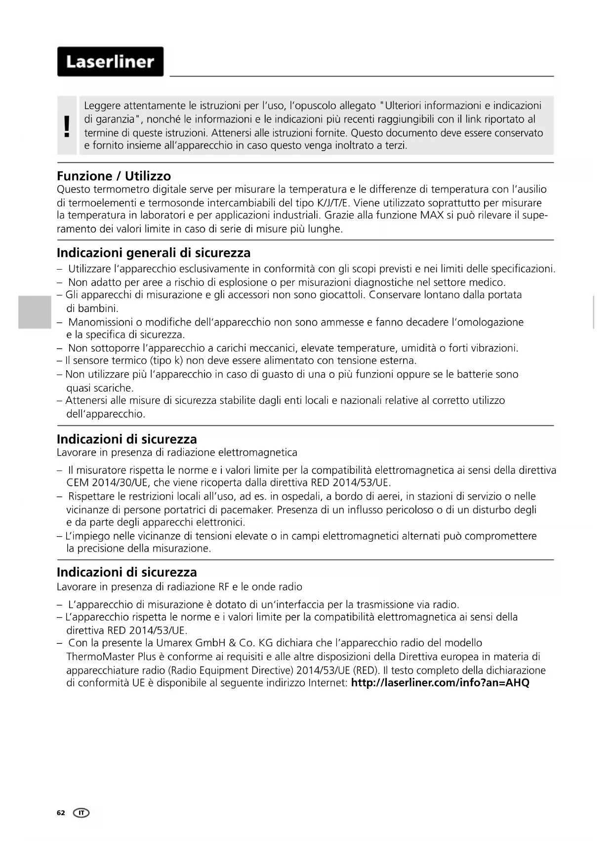 ESFunzione / Utilizzo Questo termometro digitale serve per misurare la temperatura e le differenze di temperatura con l‘ausilio di termoelementi e termosonde intercambiabili del tipo K/J/T/E. Viene utilizzato soprattutto per misurare la temperatura in laboratori e per applicazioni industriali. Grazie alla funzione MAX si può rilevare il supe- ramento dei valori limite in caso di serie di misure più lunghe. Indicazioni di sicurezza Lavorare in presenza di radiazione elettromagnetica – Il misuratore rispetta le norme e i valori limite per la compatibilità elettromagnetica ai sensi della direttiva CEM 2014/30/UE, che viene ricoperta dalla direttiva RED 2014/53/UE. – Rispettare le restrizioni locali all’uso, ad es. in ospedali, a bordo di aerei, in stazioni di servizio o nelle vicinanze di persone portatrici di pacemaker. Presenza di un inusso pericoloso o di un disturbo degli e da parte degli apparecchi elettronici. – L’impiego nelle vicinanze di tensioni elevate o in campi elettromagnetici alternati può compromettere la precisione della misurazione. Indicazioni di sicurezza Lavorare in presenza di radiazione RF e le onde radio – L‘apparecchio di misurazione è dotato di un‘interfaccia per la trasmissione via radio. – L’apparecchio rispetta le norme e i valori limite per la compatibilità elettromagnetica ai sensi della direttiva RED 2014/53/UE. – Con la presente la Umarex GmbH & Co. KG dichiara che l’apparecchio radio del modello ThermoMaster Plus è conforme ai requisiti e alle altre disposizioni della Direttiva europea in materia di apparecchiature radio (Radio Equipment Directive) 2014/53/UE (RED). Il testo completo della dichiarazione di conformità UE è disponibile al seguente indirizzo Internet: http://laserliner.com/info?an=AHQ Indicazioni generali di sicurezza – Utilizzare l‘apparecchio esclusivamente in conformità con gli scopi previsti e nei limiti delle specicazioni. – Non adatto per aree a rischio di esplosione o per misurazioni diagnostiche nel settore medico. – Gli apparecchi di misurazione e gli accessori non sono giocattoli. Conservare lontano dalla portata di bambini. – Manomissioni o modiche dell‘apparecchio non sono ammesse e fanno decadere l‘omologazione e la specica di sicurezza. – Non sottoporre l‘apparecchio a carichi meccanici, elevate temperature, umidità o forti vibrazioni. – Il sensore termico (tipo k) non deve essere alimentato con tensione esterna. – Non utilizzare più l‘apparecchio in caso di guasto di una o più funzioni oppure se le batterie sono quasi scariche. – Attenersi alle misure di sicurezza stabilite dagli enti locali e nazionali relative al corretto utilizzo dell‘apparecchio. Leggere attentamente le istruzioni per l‘uso, l’opuscolo allegato "Ulteriori informazioni e indicazioni di garanzia", nonché le informazioni e le indicazioni più recenti raggiungibili con il link riportato al termine di queste istruzioni. Attenersi alle istruzioni fornite. Questo documento deve essere conservato e fornito insieme all‘apparecchio in caso questo venga inoltrato a terzi.