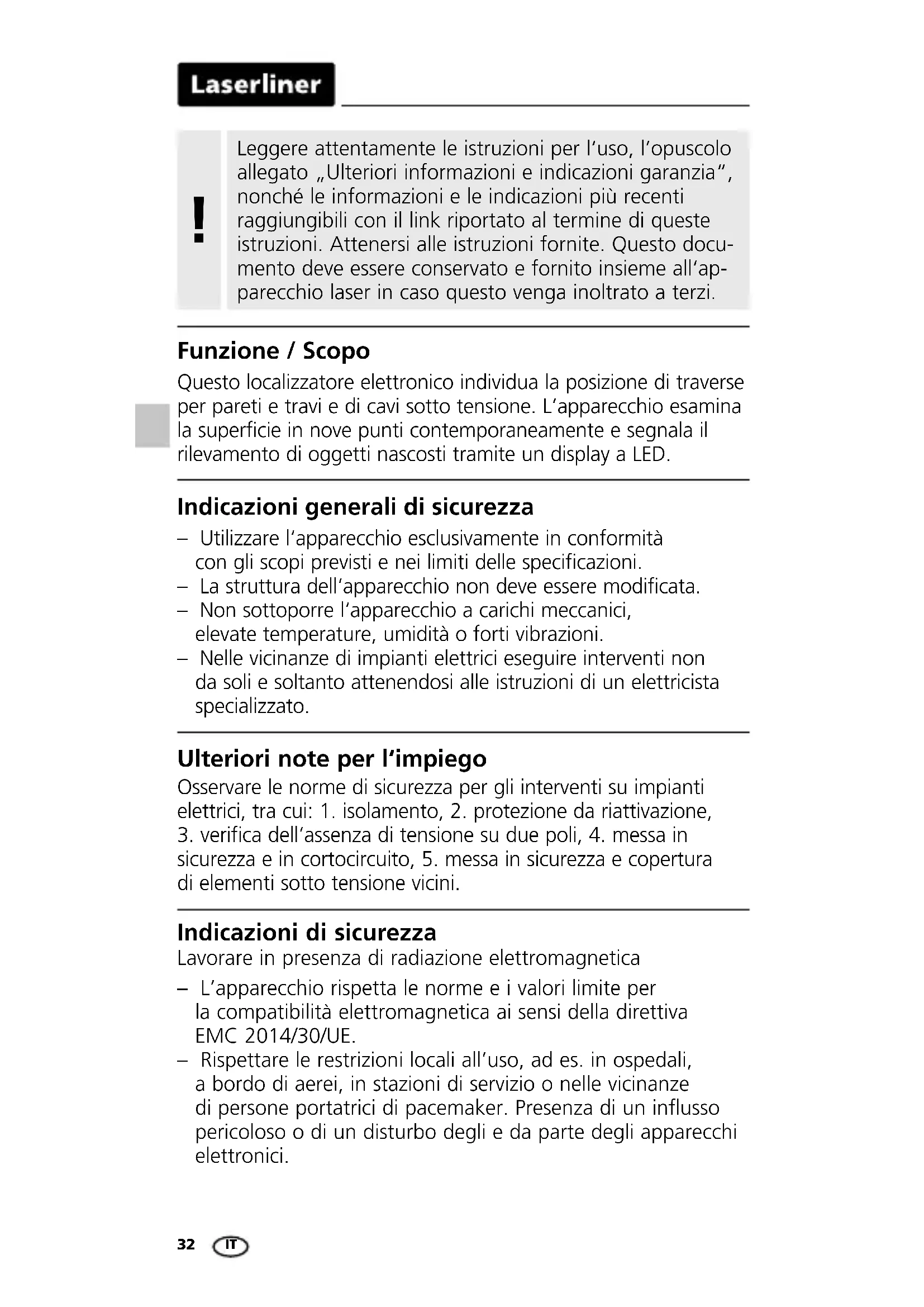 sicurezza e in cortocircuito, 5. messa in sicurezza e copertura di elementi sotto tensione vicini. Indicazioni di sicurezza Lavorare in presenza di radiazione elettromagnetica – L’apparecchio rispetta le norme e i valori limite per la compatibilità elettromagnetica ai sensi della direttiva EMC 2014/30/UE. – Rispettare le restrizioni locali all’uso, ad es. in ospedali, a bordo di aerei, in stazioni di servizio o nelle vicinanze di persone portatrici di pacemaker. Presenza di un influsso pericoloso o di un disturbo degli e da parte degli apparecchi elettronici. – Utilizzare l‘apparecchio esclusivamente in conformità con gli scopi previsti e nei limiti delle specificazioni. – La struttura dell‘apparecchio non deve essere modificata. – Non sottoporre l‘apparecchio a carichi meccanici, elevate temperature, umidità o forti vibrazioni. – Nelle vicinanze di impianti elettrici eseguire interventi non da soli e soltanto attenendosi alle istruzioni di un elettricista specializzato. Indicazioni generali di sicurezza Funzione / Scopo Leggere attentamente le istruzioni per l‘uso, l’opuscolo allegato „Ulteriori informazioni e indicazioni garanzia“, nonché le informazioni e le indicazioni più recenti raggiungibili con il link riportato al termine di queste istruzioni. Attenersi alle istruzioni fornite. Questo docu- mento deve essere conservato e fornito insieme all‘ap- parecchio laser in caso questo venga inoltrato a terzi.