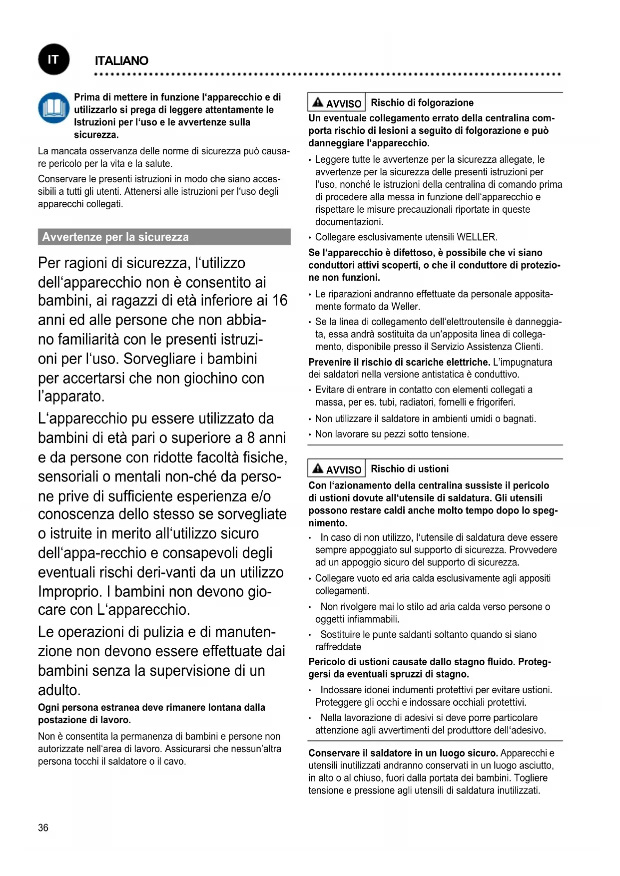 - Collegare esclusivamente utensili WELLER. Se l‘apparecchio è difettoso, è possibile che vi siano conduttori attivi scoperti, o che il conduttore di protezio- ne non funzioni.