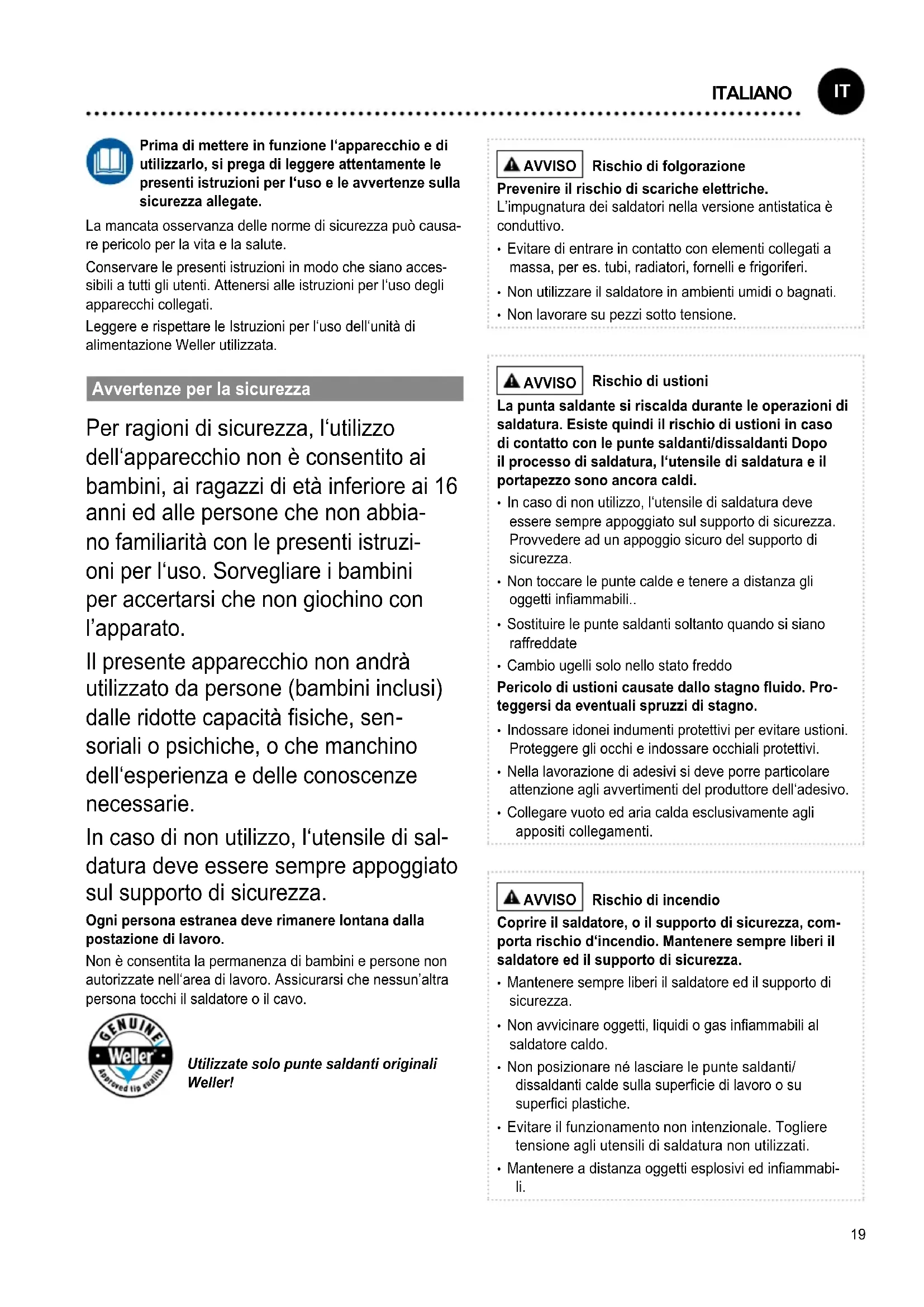 datura deve essere sempre appoggiato sul supporto di sicurezza. Ogni persona estranea deve rimanere lontana dalla postazione di lavoro. Non è consentita la permanenza di bambini e persone non autorizzate nell‘area di lavoro. Assicurarsi che nessun’altra persona tocchi il saldatore o il cavo. Utilizzate solo punte saldanti originali Weller! AVVISO Rischio di folgorazione Prevenire il rischio di scariche elettriche. L’impugnatura dei saldatori nella versione antistatica è conduttivo.