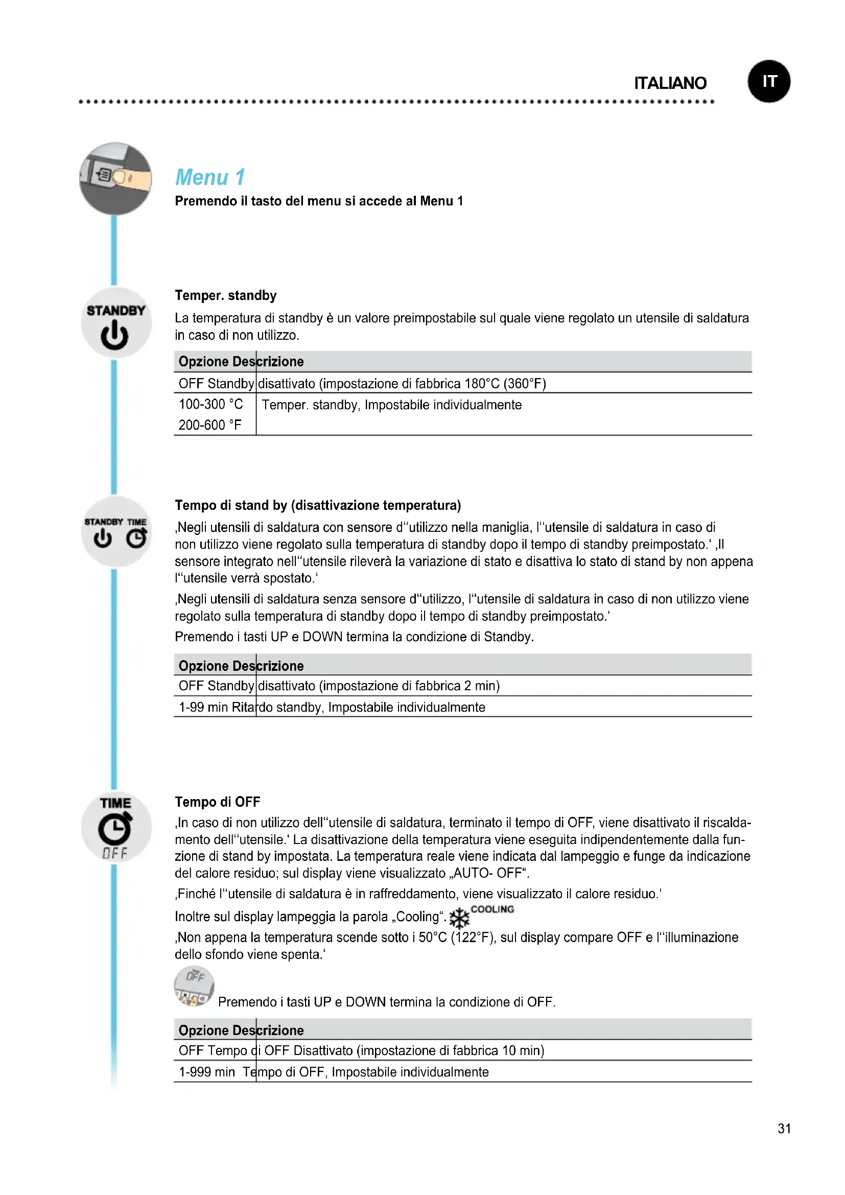 FRANÇAIS31 Menu 1 Premendo il tasto del menu si accede al Menu 1 Temper. standby La temperatura di standby è un valore preimpostabile sul quale viene regolato un utensile di saldatura in caso di non utilizzo. Opzione Descrizione OFF Standby disattivato (impostazione di fabbrica 180°C (360°F) 100-300 °C 200-600 °F Temper. standby, Impostabile individualmente Tempo di stand by (disattivazione temperatura) ‚Negli utensili di saldatura con sensore d‘‘utilizzo nella maniglia, l‘‘utensile di saldatura in caso di non utilizzo viene regolato sulla temperatura di standby dopo il tempo di standby preimpostato.‘ ‚Il sensore integrato nell‘‘utensile rileverà la variazione di stato e disattiva lo stato di stand by non appena l‘‘utensile verrà spostato.‘ ‚Negli utensili di saldatura senza sensore d‘‘utilizzo, l‘‘utensile di saldatura in caso di non utilizzo viene regolato sulla temperatura di standby dopo il tempo di standby preimpostato.‘ Premendo i tasti UP e DOWN termina la condizione di Standby. Opzione Descrizione OFF Standby disattivato (impostazione di fabbrica 2 min) 1-99 min Ritardo standby, Impostabile individualmente Tempo di OFF ‚In caso di non utilizzo dell‘‘utensile di saldatura, terminato il tempo di OFF, viene disattivato il riscalda- mento dell‘‘utensile.‘ La disattivazione della temperatura viene eseguita indipendentemente dalla fun- zione di stand by impostata. La temperatura reale viene indicata dal lampeggio e funge da indicazione del calore residuo; sul display viene visualizzato „AUTO- OFF“. ‚Finché l‘‘utensile di saldatura è in raffreddamento, viene visualizzato il calore residuo.‘ Inoltre sul display lampeggia la parola „Cooling“. ‚Non appena la temperatura scende sotto i 50°C (122°F), sul display compare OFF e l‘‘illuminazione dello sfondo viene spenta.‘ Premendo i tasti UP e DOWN termina la condizione di OFF. Opzione Descrizione OFF Tempo di OFF Disattivato (impostazione di fabbrica 10 min) 1-999 min Tempo di OFF, Impostabile individualmente