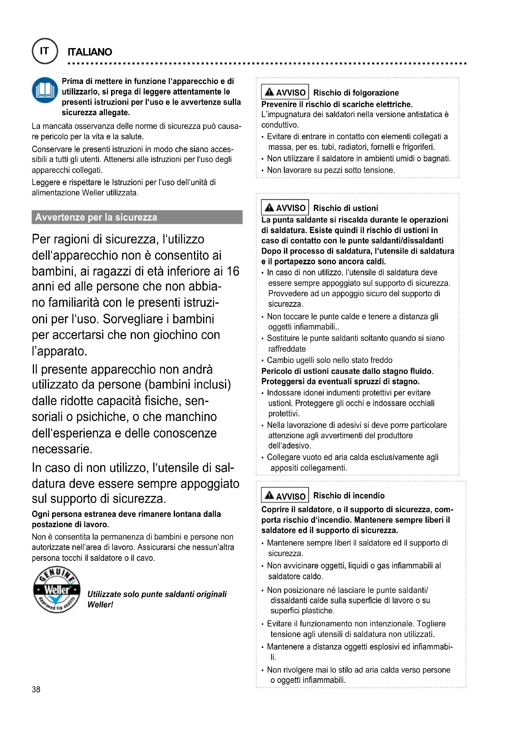 ITALIANO Prima di mettere in funzione l‘apparecchio e di utilizzarlo, si prega di leggere attentamente le presenti istruzioni per l‘uso e le avvertenze sulla sicurezza allegate. La mancata osservanza delle norme di sicurezza può causa- re pericolo per la vita e la salute. Conservare le presenti istruzioni in modo che siano acces- sibili a tutti gli utenti. Attenersi alle istruzioni per l‘uso degli apparecchi collegati. Leggere e rispettare le Istruzioni per l‘uso dell‘unit di alimentazione Weller utilizzata. Avvertenze per la sicurezza Per ragioni di sicurezza, l‘utilizzo dell‘apparecchio non è consentito ai bambini, ai ragazzi di età inferiore ai 16 anni ed alle persone che non abbia- no familiarità con le presenti istruzi- oni per l‘uso. Sorvegliare i bambini per accertarsi che non giochino con l’apparato. Il presente apparecchio non andrà utilizzato da persone (bambini inclusi) dalle ridotte capacit siche, sen