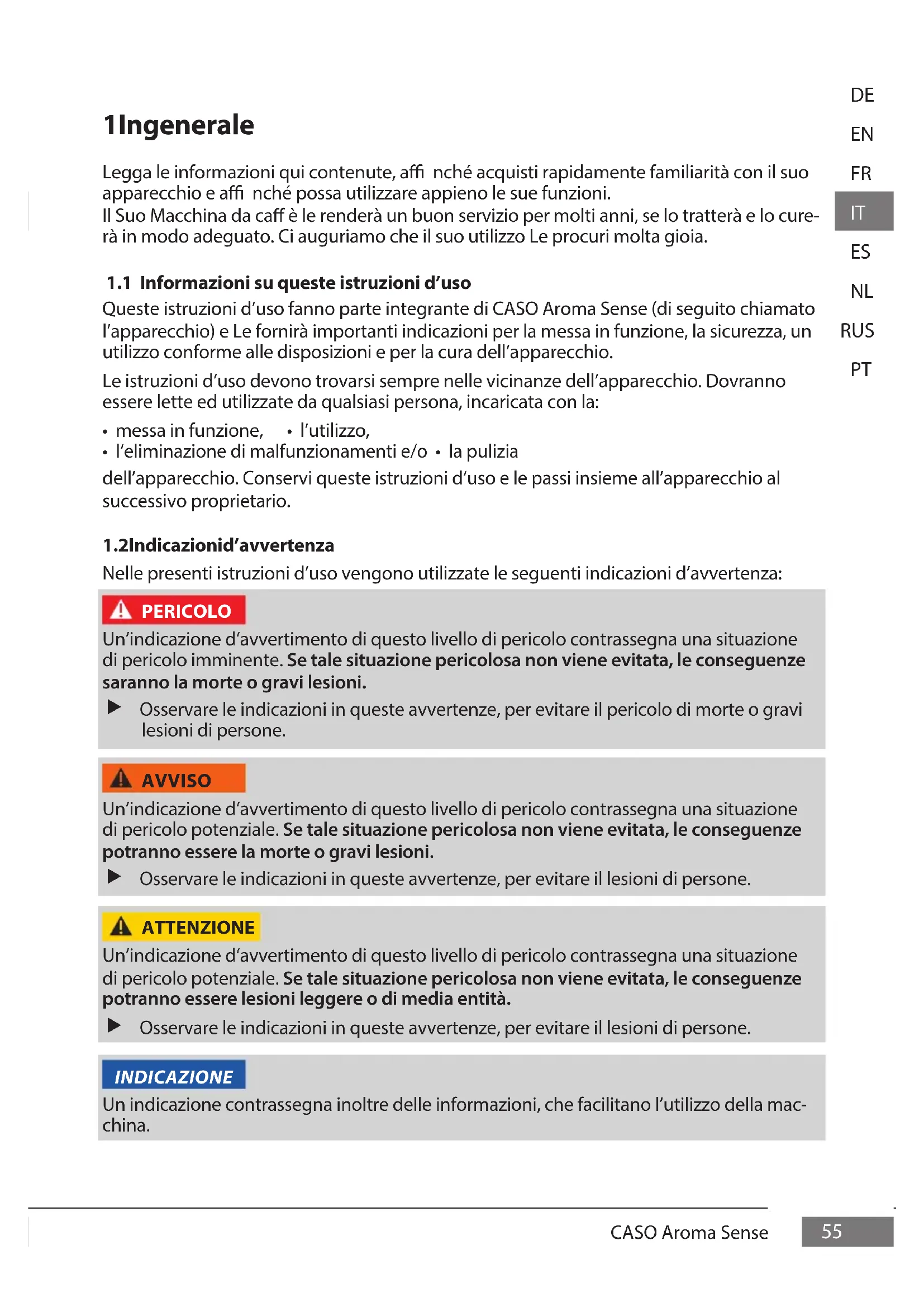 Queste istruzioni d’uso fanno parte integrante di CASO Aroma Sense (di seguito chiamato l’apparecchio) e Le fornirà importanti indicazioni per la messa in funzione, la sicurezza, un utilizzo conforme alle disposizioni e per la cura dell’apparecchio. Le istruzioni d‘uso devono trovarsi sempre nelle vicinanze dell’apparecchio. Dovranno essere lette ed utilizzate da qualsiasi persona, incaricata con la: