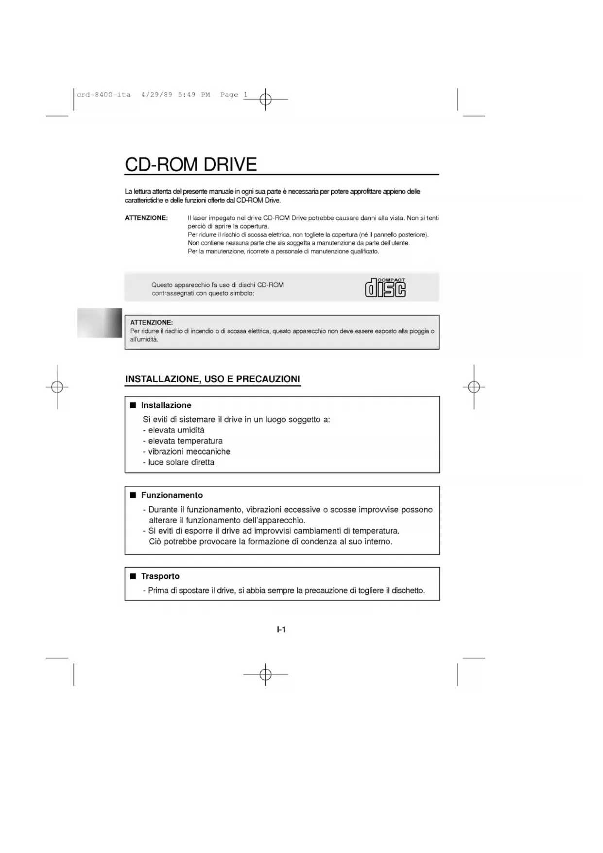 Diametredes disques 12cm/8cmVitessederotation 8,750 tours/minI-1QuestoapparecchiofausodidischiCD-ROMcontrassegnaticonquestosimbolo:COMPACTATTENZIONE:Perridurreilrischiodiincendioodiscossaelettrica,questoapparecchionondeveessereespostoallapioggiaoall'umidita. Italiano CD-ROM DRIVE Lalettura attenta del presente manualein ogni sua parte enecessariaper potere approfittare appieno dellecaratteristiche dellefunzionioffertedalCD-ROMDrive.ATTENZIONE:IllaserimpegatoneldriveCD-ROMDrivepotrebbecausaredannialla vista.Nonsitentiperciodiaprirelacopertura.Perridurreilrischiodiscossaelettrica,nontoglietelacopertura(neilpannelloposteriore).Noncontienenessunapartechesiasoggettaamanutenzionedapartedell'utente.Perlamanutenzione,ricorreteapersonaledimanutenzionequalificato. INSTALLAZIONE, USO PRECAUZIONI InstallazioneSievitidisistemareildriveinun luogo soggetto a:-elevata umidita-elevata temperatura -vibrazionimeccaniche-lucesolaredirettaFunzionamento-Duranteil funzionamento, vibrazionieccessiveoscosse improvvise possonoalterareilfunzionamento dell'apparecchio. -Sievitidiesporreildrivead improvvisi cambiamentidi temperatura. Cio potrebbe provocarelaformazionedicondenzaalsuointerno. Trasporto -Primadi spostare drive, siabbiasemprela precauzione togliere ildischetto.crd-8400-ita4/29/895:49PMPage1I-2 CARATTERISTICHE CARATTERISTICHE InterfacciaE-IDE Tempo diaccessomedio75ms Compatibile conPCmultimedia Supporto multisessioneCDPhoto Larghezza dibandaCPU piccola (spec. MPC) Sistemaditrasferimentodati 40x-speed Sistema intelligente dibufferizzazionedeidati Supporto audioadaltafedeltaCaricamentoda tray[vassoio] senzasistema caddy[carrello] Progettazione specifica peril montaggio interno Supporto per l'Espulsione Emergenza Semplice supporto dicomandoa pulsante perilCDaudio REQUISITI DEL SISTEMA PCIBMo compatibile coni seguenti componenti disistema:486SX compatibile IBMo quanto indicatosopraunminimodi640Kdimemoriaundriveper floppy disk (da 3,5 pollici) versioneMS-DOS3.1o superiore