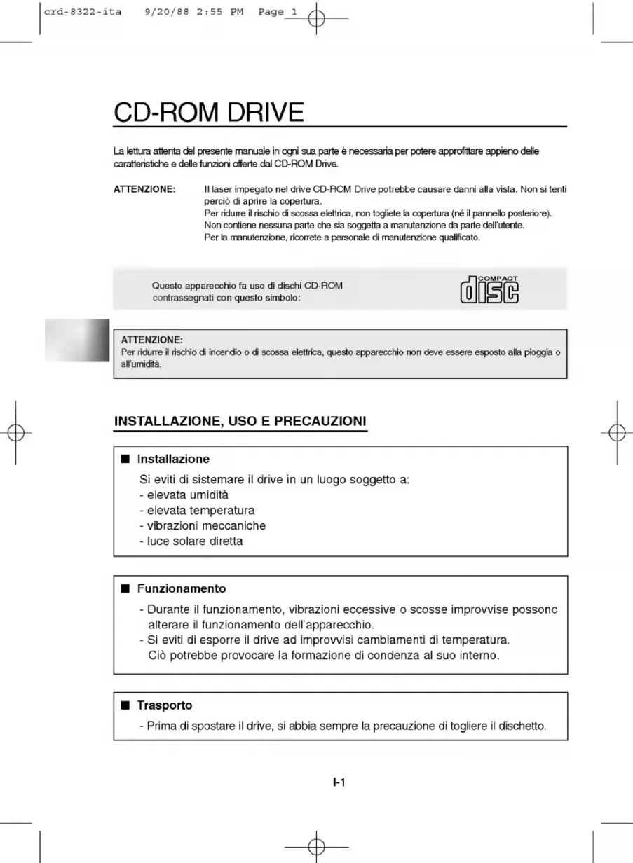 delle funzioni offerte dal CD-ROM Drive. ATTENZIONE:IllaserimpegatoneldriveCD-ROMDrivepotrebbecausaredanniallavista.Nonsitenti percio diaprirelacopertura.Perridurreilrischiodiscossaelettrica,nontoglietelacopertura(neilpannelloposteriore).Noncontienenessunapartechesiasoggettaamanutenzionedapartedell'utente.Perlamanutenzione,ricorreteapersonaledimanutenzionequalificato. INSTALLAZIONE, USOEPRECAUZIONIInstallazioneSievitidisistemareildriveinun luogo soggetto a:-elevata umidita -elevata temperatura -vibrazionimeccaniche-lucesolaredirettaFunzionamento-Duranteil funzionamento, vibrazionieccessiveoscosse improvvise possono alterareilfunzionamento dell'apparecchio. -Sievitidi esporre ildrivead improvvisi cambiamentidi temperatura. Cio potrebbe provocare laformazionedicondenzaalsuointerno. Trasporto -Primadi spostare drive, siabbia sempre precauzione togliere ildischetto.crd-8322-ita 9/20/88 2:55PMPage1I-2 CARATTERISTICHE CARATTERISTICHE InterfacciaE-IDE Tempo diaccessomedio75ms Compatibile conPCmultimedia Supporto multisessioneCDPhoto Larghezza dibandaCPU piccola (spec. MPC) Sistemaditrasferimentodati 32x-speed Sistema intelligente dibufferizzazionedeidati Supporto audioadaltafedeltaCaricamentoda tray[vassoio] senzasistema caddy[carrello] Progettazione specifica peril montaggio interno Supporto per l'Espulsione Emergenza Semplice supporto dicomandoa pulsante perilCDaudio REQUISITI DEL SISTEMA PCIBMo compatibile coni seguenti componenti disistema:486SX compatibile IBMo quanto indicatosopraunminimodi640Kdimemoriaundriveper floppy disk (da 3,5 pollici) versioneMS-DOS3.1o superiore Accessori forniti: NomeManualeUtenteDischettoperl'InstallazioneCavoAudioSchedadiComandoIDECavodiInterfaccia Quantita (Optional) (Optional) crd-8322-ita 9/20/88 2:55