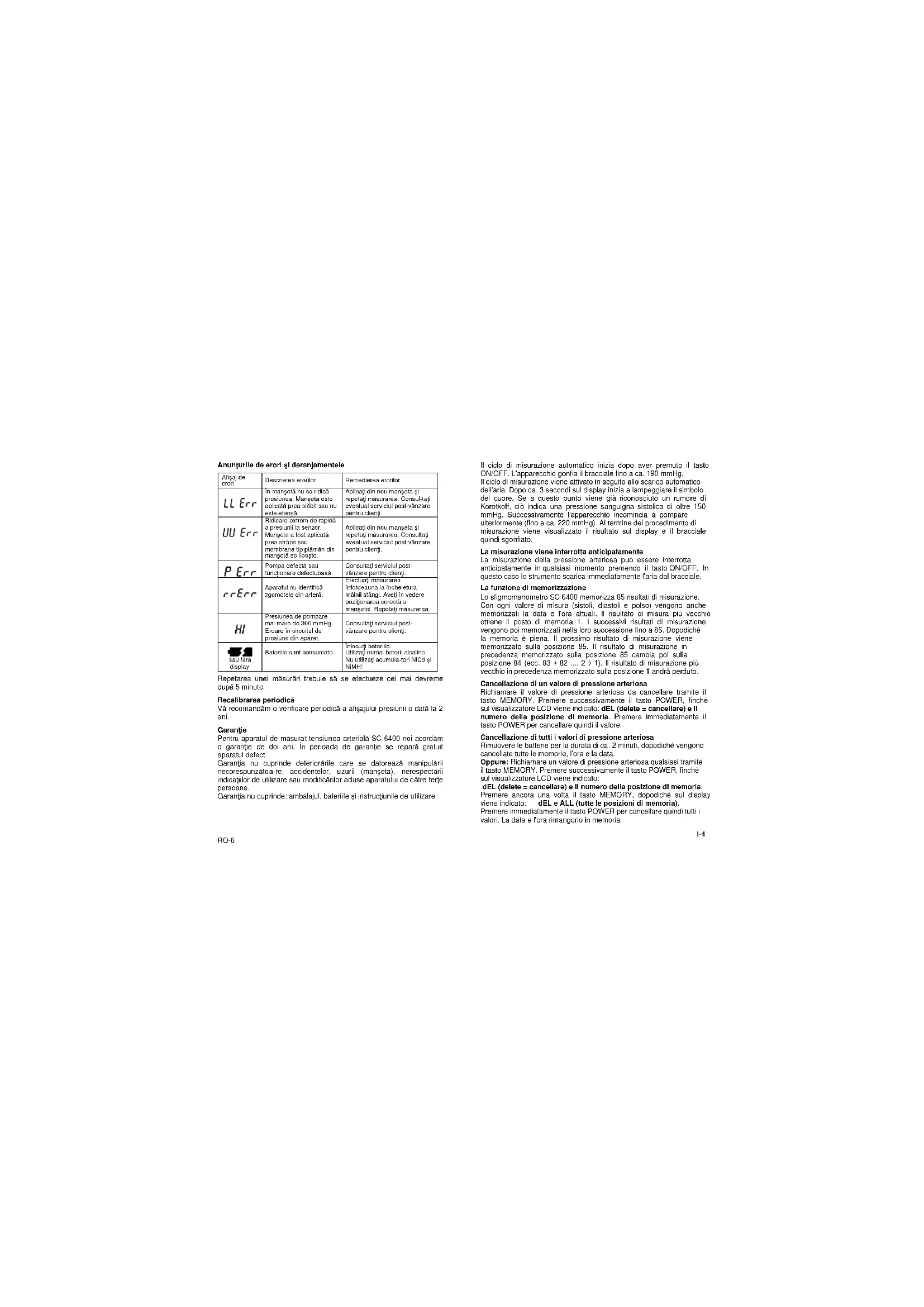 RO-6 Il ciclo di misurazione automatico inizia dopo aver premuto il tasto ON/OFF. L'apparecchio gonfia il bracciale fino a ca. 190 mmHg. Il ciclo di misurazione viene attivato in seguito allo scarico automatico dell'aria. Dopo ca. 3 secondi sul display inizia a lampeggiare il simbolo del cuore. Se a questo punto viene già riconosciuto un rumore di Korotkoff, ciò indica una pressione sanguigna sistolica di oltre 150 mmHg. Successivamente l'apparecchio incomincia a pompare ulteriormente (fino a ca. 220 mmHg). Al termine del procedimento di misurazione viene visualizzato il risultato sul display e il bracciale quindi sgonfiato. La misurazione viene interrotta anticipatamente La misurazione della pressione arteriosa può essere interrotta anticipatamente in qualsiasi momento premendo il tasto ON/OFF. In questo caso lo strumento scarica immediatamente l'aria dal bracciale. La funzione di memorizzazione Lo sfigmomanometro SC 6400 memorizza 85 risultati di misurazione. Con ogni valore di misura (sistoli, diastoli e polso) vengono anche memorizzati la data e l'ora attuali. Il risultato di misura più vecchio ottiene il posto di memoria 1. I successivi risultati di misurazione vengono poi memorizzati nella loro successione fino a 85. Dopodiché la memoria è piena. Il prossimo risultato di misurazione viene memorizzato sulla posizione 85. Il risultato di misurazione in precedenza memorizzato sulla posizione 85 cambia poi sulla posizione 84 (ecc. 83 82 .... 2 1). Il risultato di misurazione più vecchio in precedenza memorizzato sulla posizione 1 andrà perduto
