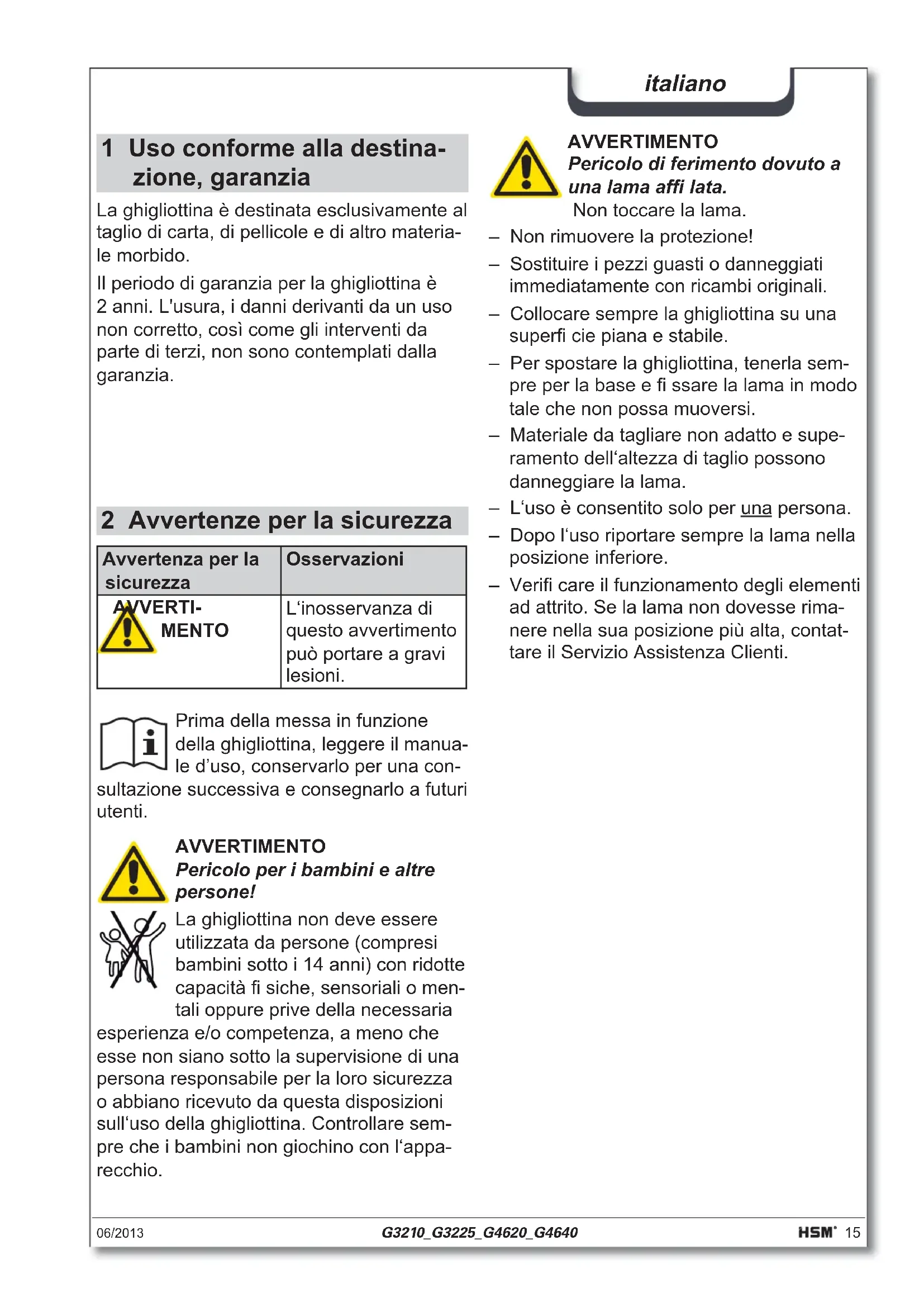 Hauteur de coupe max. (mm) 1,0 2,5 2,0 4,0 Format max. A4 A4 A3 A3 Longueur de coupe (mm) 325 325 460 460 Dispositif de pression manuel automatique automatique automatique Table de chargement (mm) 325 x 155 325 x 230 460 x 230 460 x 320 Dimensions (mm) 605 x 280 x 75 606 x 308 x 122 737 x 362 x 122 750 x 406 x 133 Poids (kg) 2,12 3,72 4,66 7,30 Remarque : Pour réduire l'espace de stockage nécessaire et fi xer la lame lors du transport du massicot, il est pos- sible de rabattre le volet de pro- tection. C'est possible uniquement si la lame est abaissée.14 G3210_G3225_G4620_G4640 06/2013 français06/2013 G3210_G3225_G4620_G4640 15 italiano 1 Uso conforme alla destina- zione, garanzia Avvertenza per la sicurezza Osservazioni AVVERTI- MENTO L‘inosservanza di questo avvertimento può portare a gravi lesioni. Prima della messa in funzione della ghigliottina, leggere il manua- le d’uso, conservarlo per una con- sultazione successiva e consegnarlo a futuri utenti. AVVERTIMENTO Pericolo per i bambini e altre persone! La ghigliottina non deve essere utilizzata da persone (compresi bambini sotto i 14 anni) con ridotte capacità fi siche, sensoriali o men- tali oppure prive della necessaria esperienza e/o competenza, a meno che esse non siano sotto la supervisione di una persona responsabile per la loro sicurezza o abbiano ricevuto da questa disposizioni sull‘uso della ghigliottina. Controllare sem- pre che i bambini non giochino con l‘appa- recchio. AVVERTIMENTO Pericolo di ferimento dovuto a una lama affi lata. Non toccare la lama. – Non rimuovere la protezione! – Sostituire i pezzi guasti o danneggiati immediatamente con ricambi originali. – Collocare sempre la ghigliottina su una superfi cie piana e stabile. – Per spostare la ghigliottina, tenerla sem- pre per la base e fi ssare la lama in modo tale che non possa muoversi. – Materiale da tagliare non adatto e supe- ramento dell‘altezza di taglio possono danneggiare la lama. – L‘uso è consentito solo per una persona. – Dopo l‘uso riportare sempre la lama nella posizione inferiore. – Verifi care il funzionamento degli elementi ad attrito. Se la lama non dovesse rima- nere nella sua posizione più alta, contat- tare il Servizio Assistenza Clienti. La ghigliottina è destinata esclusivamente al taglio di carta, di pellicole e di altro materia- le morbido. Il periodo di garanzia per la ghigliottina è 2 anni. L'usura, i danni derivanti da un uso non corretto, così come gli interventi da parte di terzi, non sono contemplati dalla garanzia. 2 Avvertenze per la sicurezza16 G3210_G3225_G4620_G4640 06/2013 italiano AVVERTENZA L‘uso della ghigliottina senza placca di protezione può provocare gravi ferite ed è quindi vietato!