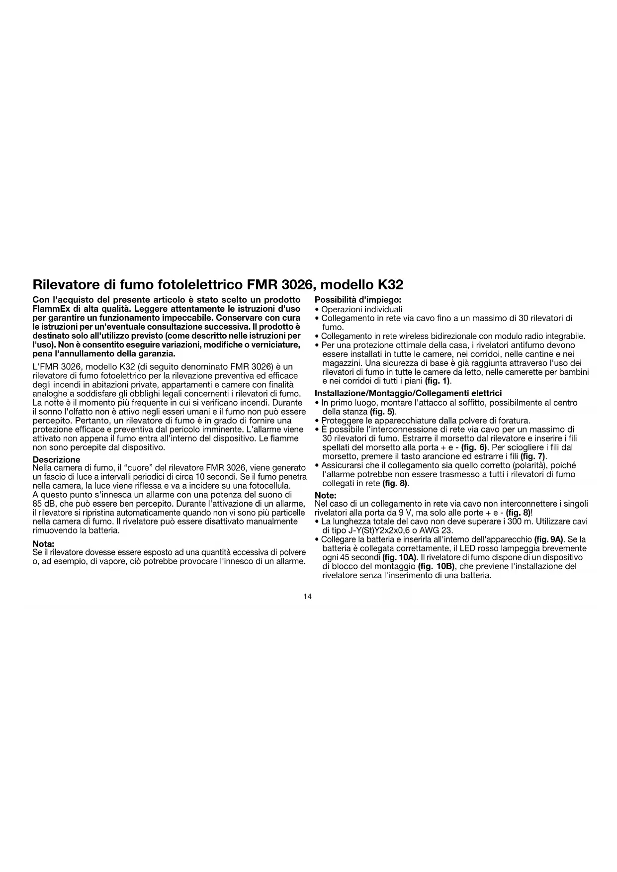 - Collegarelabatteriaeinserirlaall'internodell'apparecchio(fig. 9A).Sela batteriaècollegatacorrettamente,ilLEDrossolampeggiabrevemente ogni45secondi(fig. 10A).Ilrivelatoredifumodisponediundispositivo dibloccodelmontaggio(fig. 10B),cheprevienel'installazionedel rivelatoresenzal'inserimentodiunabatteria. Con l'acquisto del presente articolo è stato scelto un prodotto FlammEx di alta qualità. Leggere attentamente le istruzioni d'uso per garantire un funzionamento impeccabile. Conservare con cura le istruzioni per un'eventuale consultazione successiva. Il prodotto è destinato solo all'utilizzo previsto (come descritto nelle istruzioni per l'uso). Non è consentito eseguire variazioni, modifiche o verniciature, pena l'annullamento della garanzia. L'FMR3026,modelloK32(diseguitodenominatoFMR3026)èun rilevatoredifumofotoelettricoperlarilevazionepreventivaedecace degliincendiinabitazioniprivate,appartamentiecamereconnalità analogheasoddisfaregliobblighilegaliconcernentiirilevatoridifumo. Lanotteèilmomentopiùfrequenteincuisivericanoincendi.Durante ilsonnol'olfattononèattivonegliesseriumanieilfumononpuòessere percepito.Pertanto,unrilevatoredifumoèingradodifornireuna protezioneecaceepreventivadalpericoloimminente.L'allarmeviene attivatononappenailfumoentraall'internodeldispositivo.Leamme nonsonopercepitedaldispositivo. Descrizione Nellacameradifumo,il“cuore”delrilevatoreFMR3026,vienegenerato unfasciodiluceaintervalliperiodicidicirca10secondi.Seilfumopenetra nellacamera,lalucevieneriessaevaaincideresuunafotocellula. Aquestopuntos'innescaunallarmeconunapotenzadelsuonodi 85dB,chepuòesserebenpercepito.Durantel'attivazionediunallarme, ilrilevatoresiripristinaautomaticamentequandononvisonopiùparticelle nellacameradifumo.Ilrivelatorepuòesseredisattivatomanualmente rimuovendolabatteria. Nota: Seilrilevatoredovesseessereespostoadunaquantitàeccessivadipolvere o,adesempio,divapore,ciòpotrebbeprovocarel'innescodiunallarme. Rilevatore di fumo fotolelettrico FMR 3026, modello K3215 GBFRITPL DE