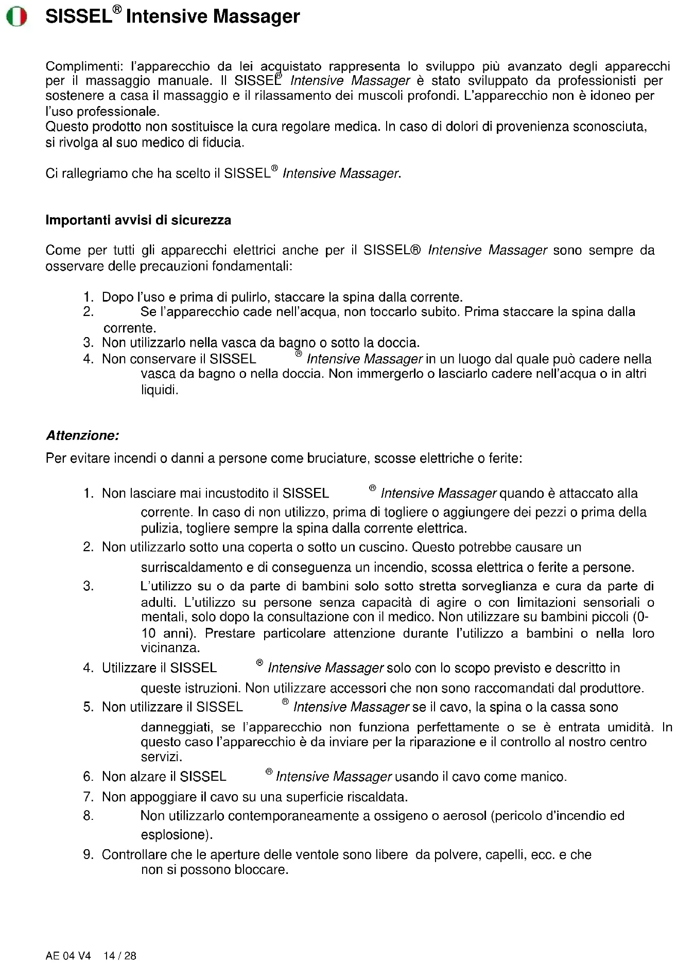 Importanti avvisi di sicurezza Come per tutti gli apparecchi elettrici anche per il SISSEL® Intensive Massager sono sempre da osservare delle precauzioni fondamentali: