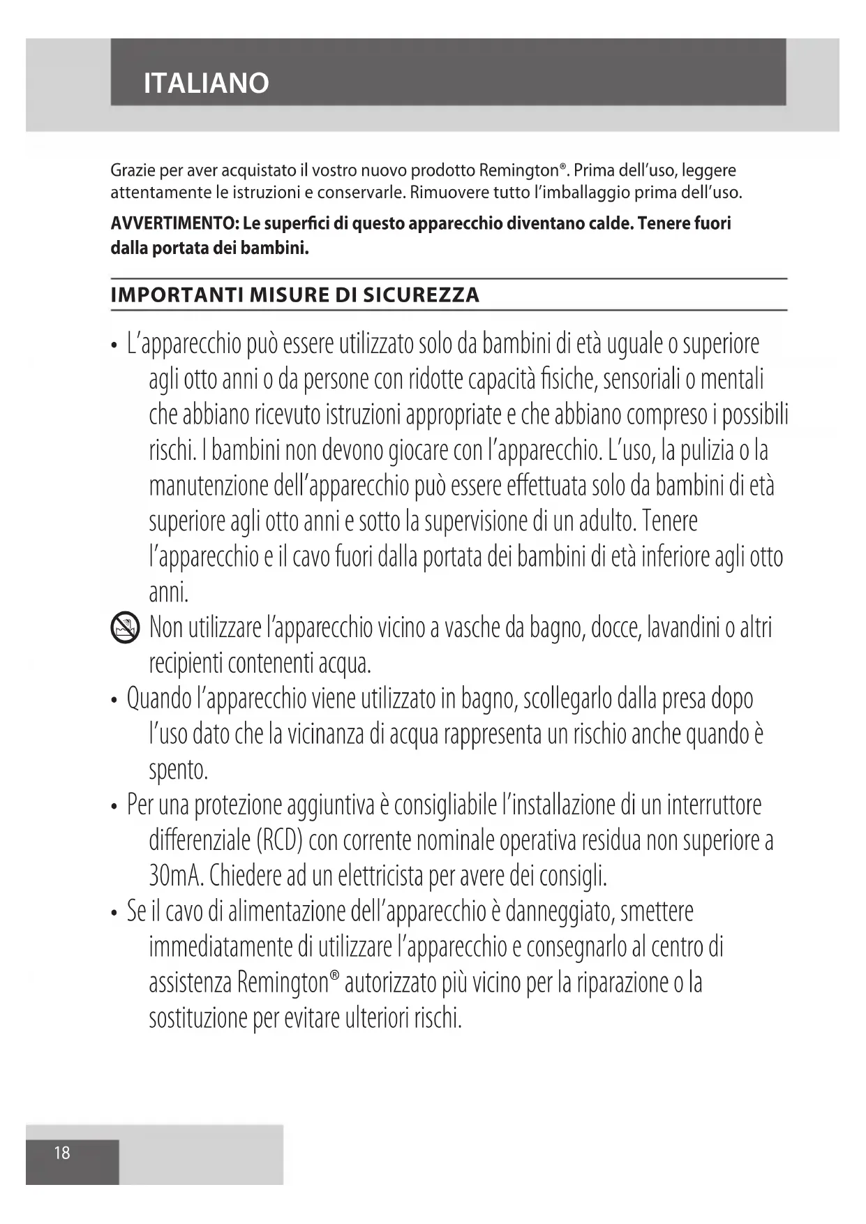 AE18 ITALIANO Grazie per aver acquistato il vostro nuovo prodotto Remington®. Prima dell’uso, leggere attentamente le istruzioni e conservarle. Rimuovere tutto l’imballaggio prima dell’uso. AVVERTIMENTO: Le superci di questo apparecchio diventano calde. Tenere fuori dalla portata dei bambini.