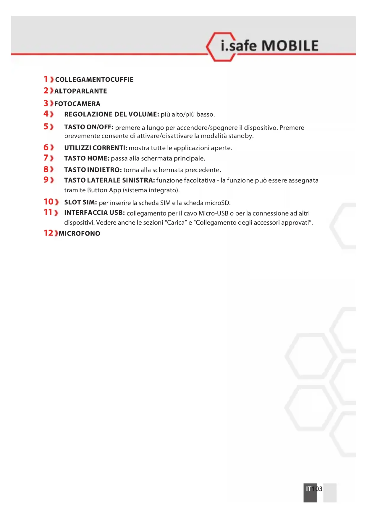 Quando si accende il dispositivo per la prima volta, seguire le istruzioni visualizzate sullo schermo. Ulteriori informazioni sul funzionamento del dispositivo sono disponibili all’indirizzo www.isafe-mobile.com/en/support/service alla voce di menu “FAQ” (Domande frequenti). Informazioni dettagliate sul funzionamento del sistema operativo Android sono disponibili all’indirizzo: https://support.google.com/android AVVISO Il microfono si trova nella parte inferiore del dispositivo. Per una comunicazione ottimale, assicuratevi che il microfono non sia coperto.IT 109