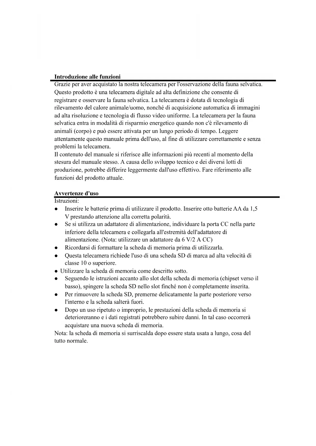 BRAUN Photo Technik GmbH Merkurstr. 8 72184 Eutingen Germany post@braun-phototechnik.de / www.braun-phototechnik.deIntroduzione alle funzioni Grazie per aver acquistato la nostra telecamera per l'osservazione della fauna selvatica. Questo prodotto è una telecamera digitale ad alta definizione che consente di registrare e osservare la fauna selvatica. La telecamera è dotata di tecnologia di rilevamento del calore animale/uomo, nonché di acquisizione automatica di immagini ad alta risoluzione e tecnologia di flusso video uniforme. La telecamera per la fauna selvatica entra in modalità di risparmio energetico quando non c'è rilevamento di animali (corpo) e può essere attivata per un lungo periodo di tempo. Leggere attentamente questo manuale prima dell'uso, al fine di utilizzare correttamente e senza problemi la telecamera. Il contenuto del manuale si riferisce alle informazioni più recenti al momento della stesura del manuale stesso. A causa dello sviluppo tecnico e dei diversi lotti di produzione, potrebbe differire leggermente dall'uso effettivo. Fare riferimento alle funzioni del prodotto attuale. Avvertenze d'uso Istruzioni: Inserire le batterie prima di utilizzare il prodotto. Inserire otto batterie AA da 1,5 V prestando attenzione alla corretta polarità. Se si utilizza un adattatore di alimentazione, individuare la porta CC nella parte inferiore della telecamera e collegarla all'estremità dell'adattatore di alimentazione. (Nota: utilizzare un adattatore da 6 V/2 A CC) Ricordarsi di formattare la scheda di memoria prima di utilizzarla. Questa telecamera richiede l'uso di una scheda SD di marca ad alta velocità di classe 10 o superiore. Utilizzare la scheda di memoria come descritto sotto. Seguendo le istruzioni accanto allo slot della scheda di memoria (chipset verso il basso), spingere la scheda SD nello slot finché non è completamente inserita. Per rimuovere la scheda SD, premerne delicatamente la parte posteriore verso l'interno e la scheda salterà fuori. Dopo un uso ripetuto o improprio, le prestazioni della scheda di memoria si deterioreranno e i dati registrati potrebbero subire danni. In tal caso occorrerà acquistare una nuova scheda di memoria. Nota: la scheda di memoria si surriscalda dopo essere stata usata a lungo, cosa del tutto normale.Tasti, interfaccia e funzione delle spie luminose