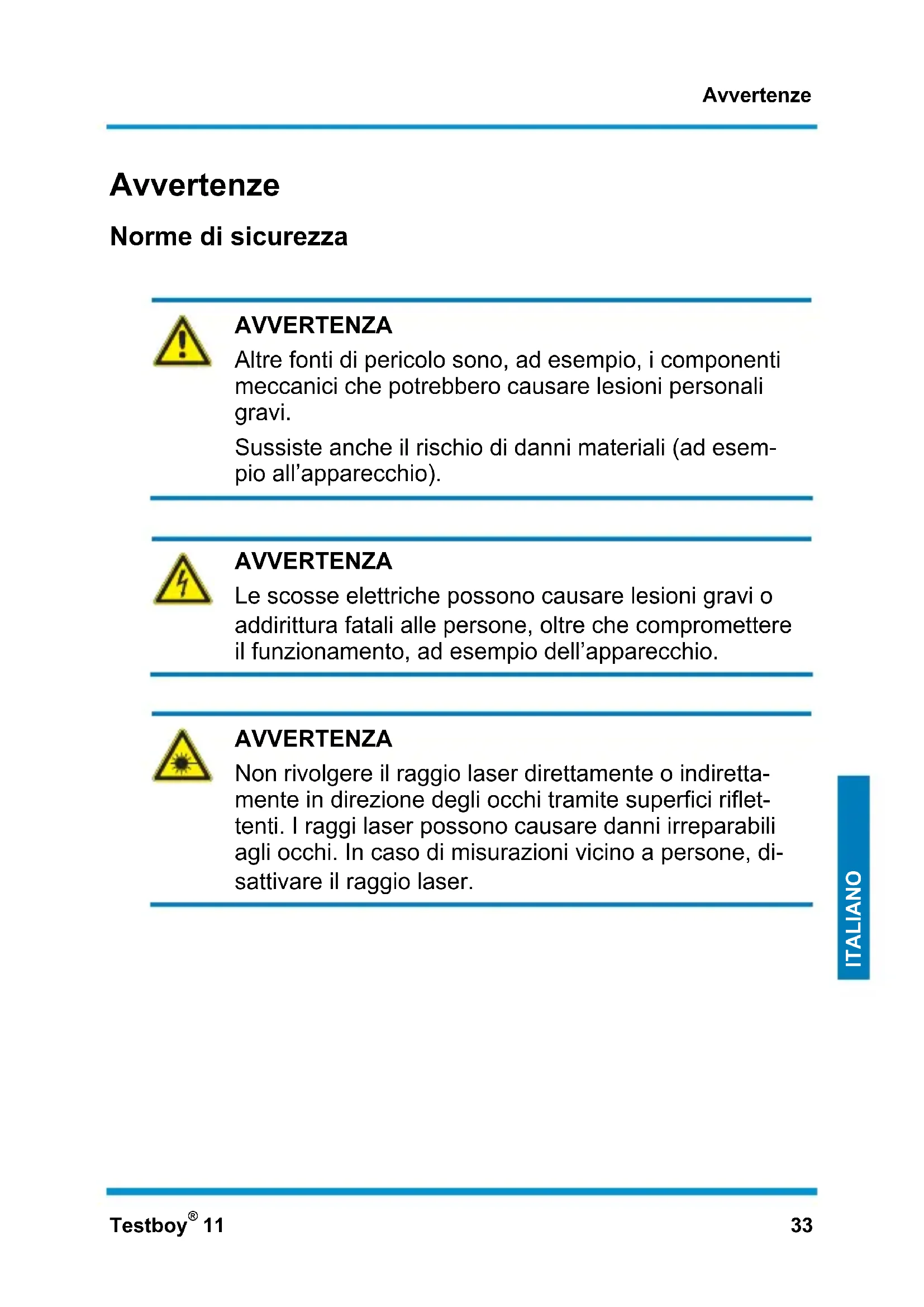 AVVERTENZA Non rivolgere il raggio laser direttamente o indiretta- mente in direzione degli occhi tramite superfici riflet- tenti. I raggi laser possono causare danni irreparabili agli occhi. In caso di misurazioni vicino a persone, di- sattivare il raggio laser.Avvertenze 34 Testboy