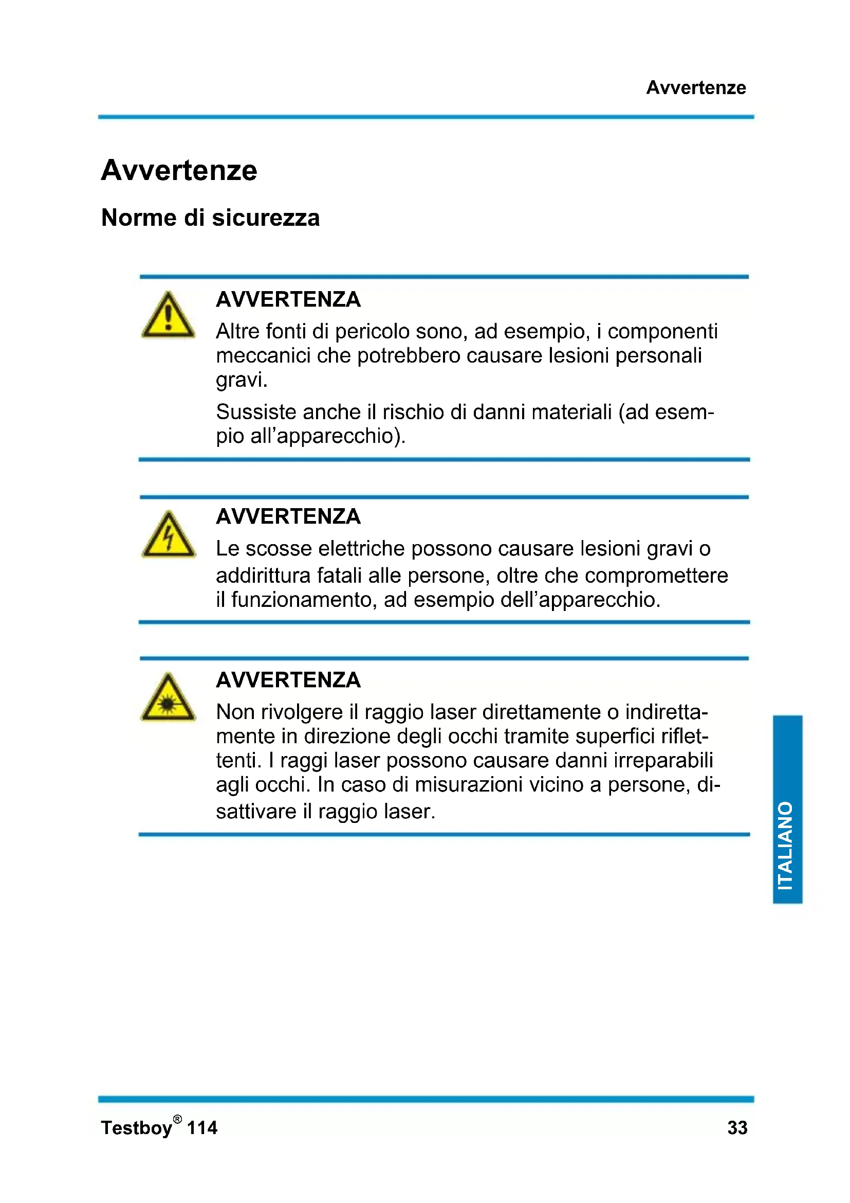 AVVERTENZA Non rivolgere il raggio laser direttamente o indiretta- mente in direzione degli occhi tramite superfici riflet- tenti. I raggi laser possono causare danni irreparabili agli occhi. In caso di misurazioni vicino a persone, di- sattivare il raggio laser.Avvertenze 34 Testboy