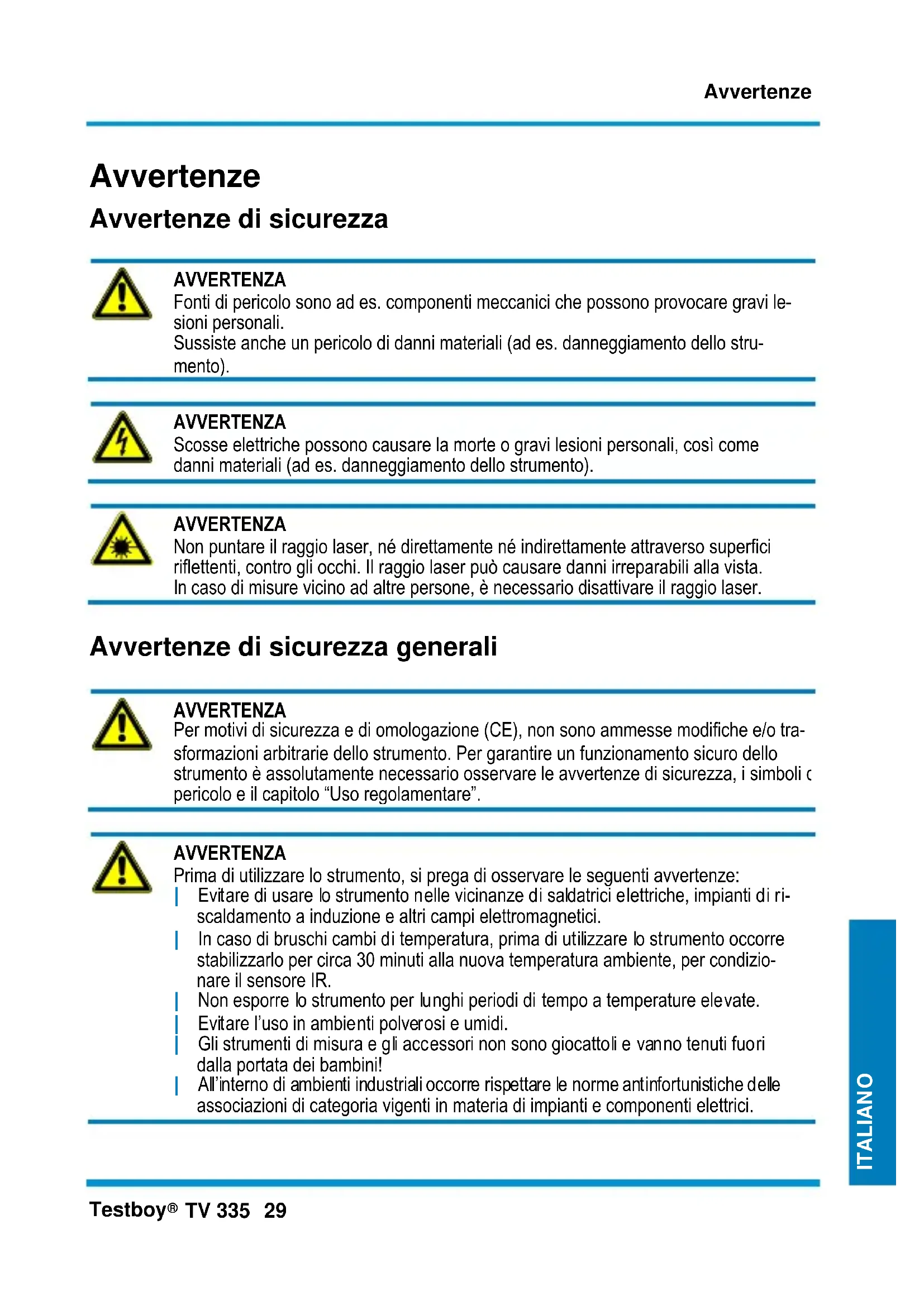 AVVERTENZA Prima di utilizzare lo strumento, si prega di osservare le seguenti avvertenze: | Evitare di usare lo strumento nelle vicinanze di saldatrici elettriche, impianti di ri- scaldamento a induzione e altri campi elettromagnetici. | In caso di bruschi cambi di temperatura, prima di utilizzare lo strumento occorre stabilizzarlo per circa 30 minuti alla nuova temperatura ambiente, per condizio- nare il sensore IR. | Non esporre lo strumento per lunghi periodi di tempo a temperature elevate. | Evitare l’uso in ambienti polverosi e umidi. | Gli strumenti di misura e gli accessori non sono giocattoli e vanno tenuti fuori dalla portata dei bambini! | All’interno di ambienti industriali occorre rispettare le norme antinfortunistiche delle associazioni di categoria vigenti in materia di impianti e componenti elettrici.Avvertenze