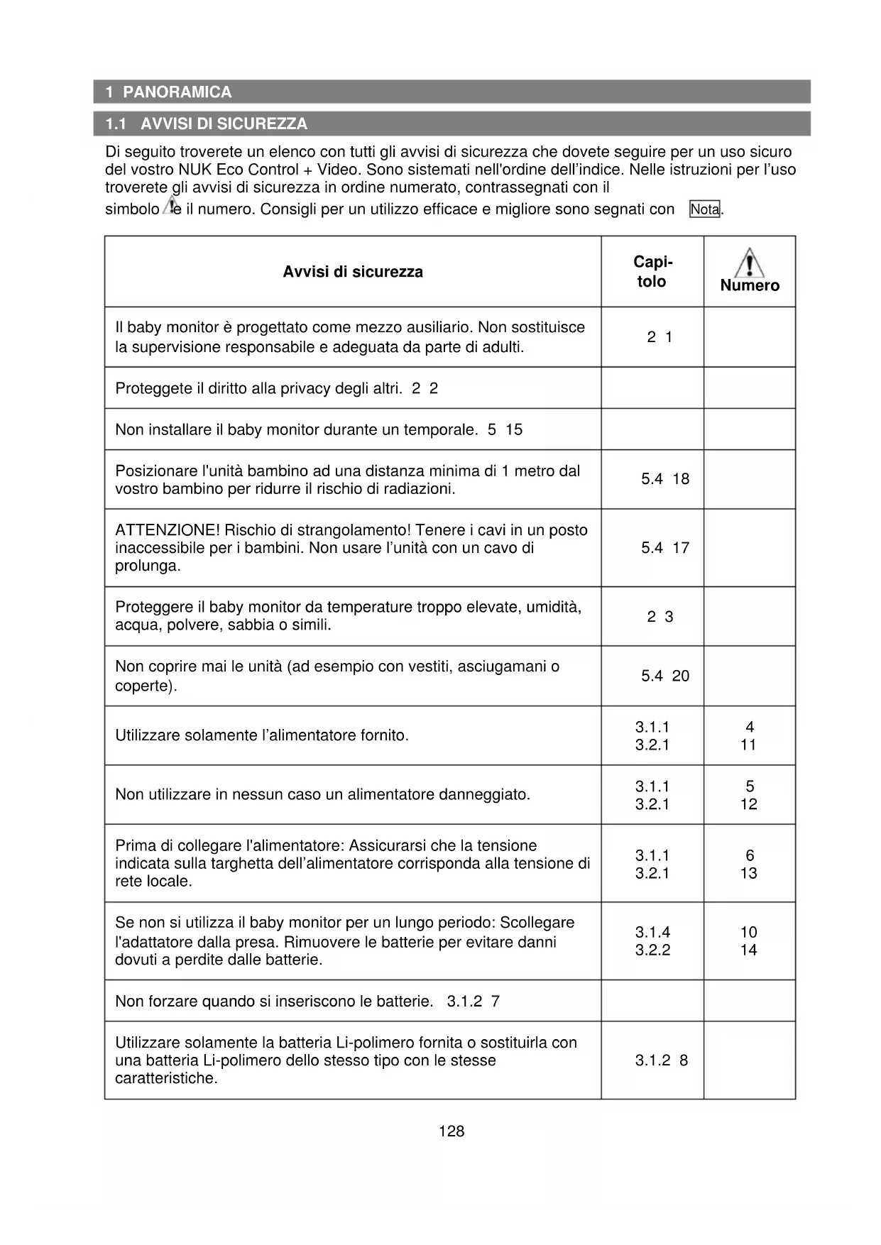 Di seguito troverete un elenco con tutti gli avvisi di sicurezza che dovete seguire per un uso sicuro del vostro NUK Eco Control + Video. Sono sistemati nell'ordine dell’indice. Nelle istruzioni per l’uso troverete gli avvisi di sicurezza in ordine numerato, contrassegnati con il simbolo e il numero. Consigli per un utilizzo efficace e migliore sono segnati con Nota