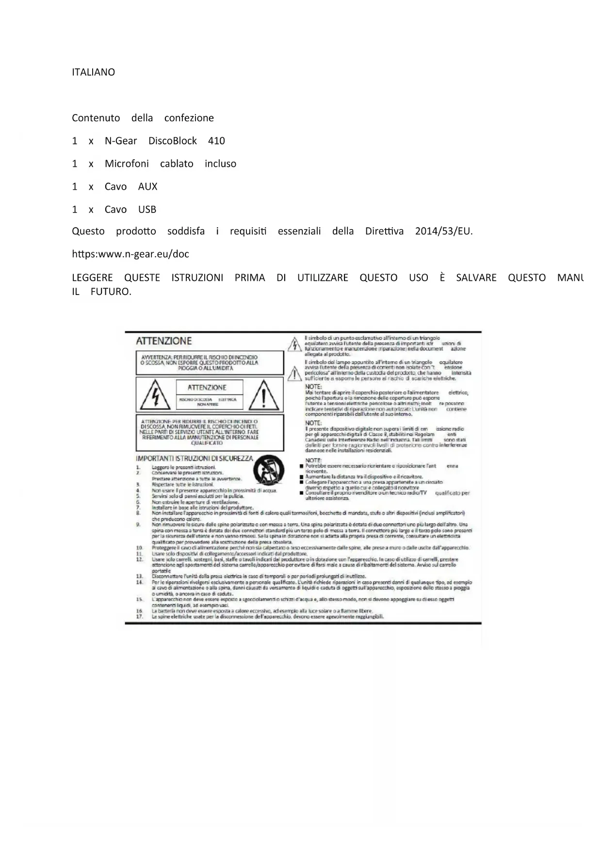 Scarica le istruzioni per il tuo Sistema karaoke in formato PDF gratuitamente! Trova il tuo manuale Disco Block 410 - N-Gear e riprendi in mano il tuo dispositivo elettronico. In questa pagina sono pubblicati tutti i documenti necessari per l'utilizzo del tuo dispositivo. Disco Block 410 del marchio N-Gear.