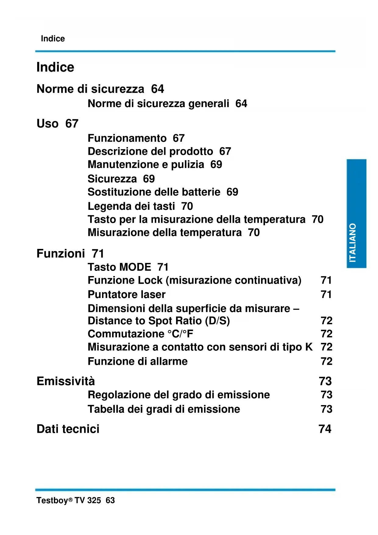 TV 325 63 DEUTSCH DEUTSCH ITALIANO Indice Norme di sicurezza 64 Norme di sicurezza generali 64 Uso 67 Funzionamento 67 Descrizione del prodotto 67 Manutenzione e pulizia 69 Sicurezza 69 Sostituzione delle batterie 69 Legenda dei tasti 70 Tasto per la misurazione della temperatura 70 Misurazione della temperatura 70 Funzioni 71 Tasto MODE 71 Funzione Lock (misurazione continuativa) 71 Puntatore laser 71 Dimensioni della superficie da misurare – Distance to Spot Ratio (D/S) 72 Commutazione °C/°F 72 Misurazione a contatto con sensori di tipo K 72 Funzione di allarme 72 Emissività 73 Regolazione del grado di emissione 73 Tabella dei gradi di emissione 73 Dati tecnici 74Norme di sicurezza 64 Testboy