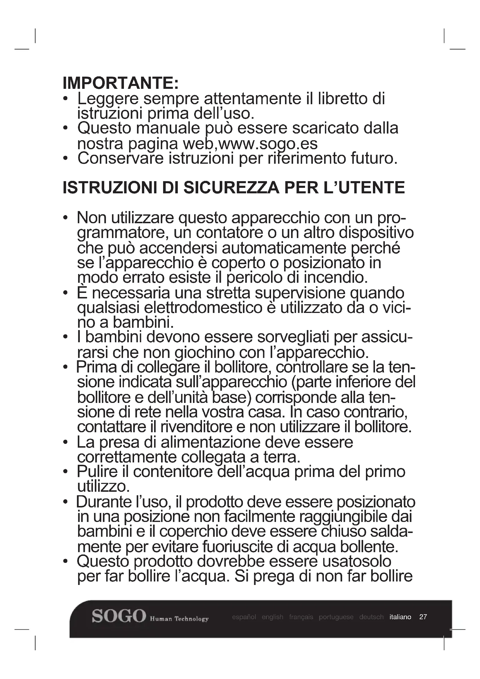 - Questo prodotto dovrebbe essere usatosolo per far bollire l’acqua. Si prega di non far bollire28 español english français portuguese deutsch italiano altri liquidi come latte e caè.