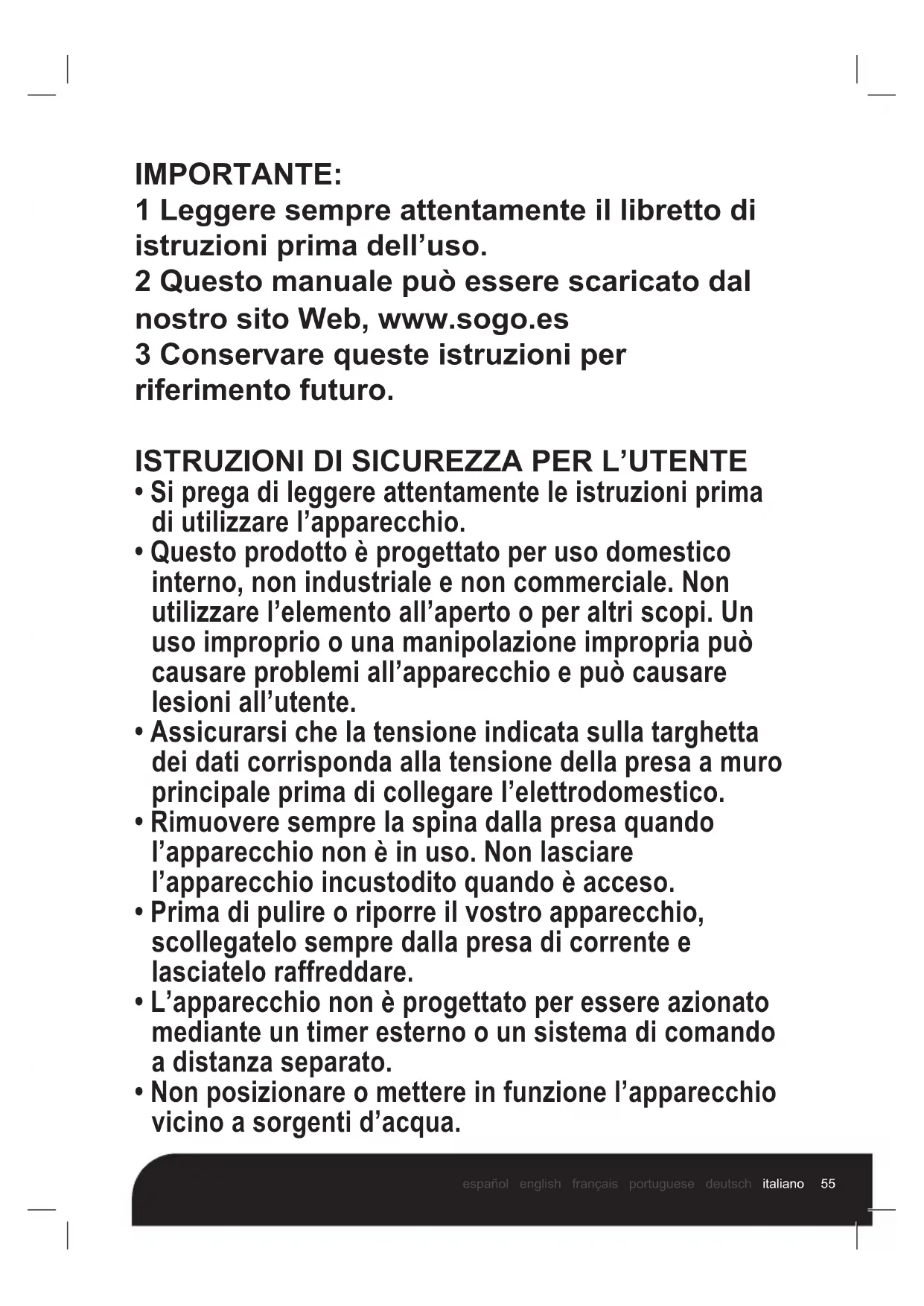IMPORTANTE: 1 Leggere sempre attentamente il libretto di istruzioni prima dell’uso. 2 Questo manuale può essere scaricato dal nostro sito Web, www.sogo.es 3 Conservare queste istruzioni per riferimento futuro.