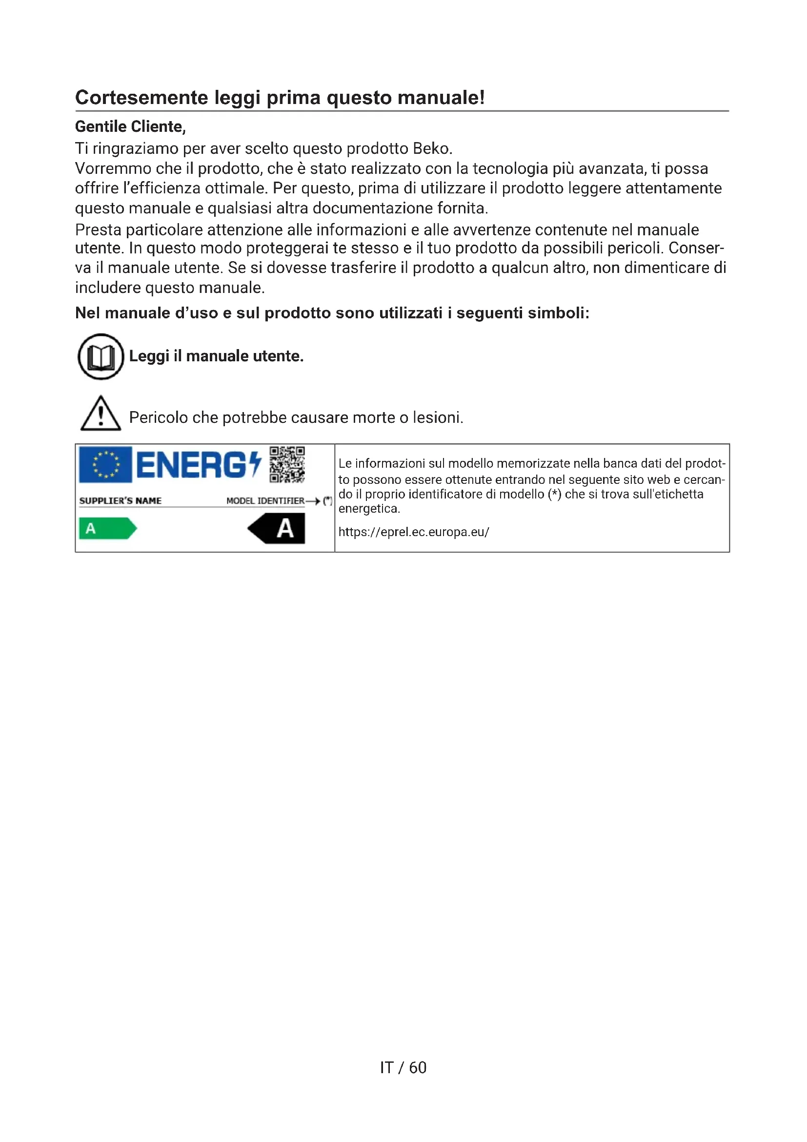 NLIT / 60 Cortesemente leggi prima questo manuale! Gentile Cliente, Ti ringraziamo per aver scelto questo prodotto Beko. Vorremmo che il prodotto, che è stato realizzato con la tecnologia più avanzata, ti possa offrire l’efficienza ottimale. Per questo, prima di utilizzare il prodotto leggere attentamente questo manuale e qualsiasi altra documentazione fornita. Presta particolare attenzione alle informazioni e alle avvertenze contenute nel manuale utente. In questo modo proteggerai te stesso e il tuo prodotto da possibili pericoli. Conser- va il manuale utente. Se si dovesse trasferire il prodotto a qualcun altro, non dimenticare di includere questo manuale. Nel manuale d’uso e sul prodotto sono utilizzati i seguenti simboli: Leggi il manuale utente. Pericolo che potrebbe causare morte o lesioni. Le informazioni sul modello memorizzate nella banca dati del prodot- to possono essere ottenute entrando nel seguente sito web e cercan- do il proprio identificatore di modello (*) che si trova sull'etichetta energetica. https://eprel.ec.europa.eu/IT / 61 Indice 1 Istruzioni di sicurezza .................... 62