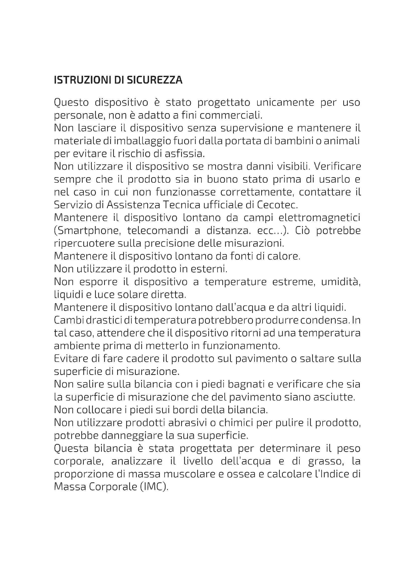 Ritirare il prodotto dalla scatola. Verificare con cura che il prodotto non sia danneggiato. Nel caso di mancanza di qualche componente o che non fosse in buono stato, contattare immediatamente il Servizio di Assistenza Tecnica di Cecotec. Ritirare l’adesivo di protezione dello scomparto delle pile situato sulla parte inferiore del dispositivo per attivarlo. Questo adesivo viene collocato per assicurare un trasporto sicuro. Informazioni aggiuntive È necessario pesarsi senza indumenti e con i piedi scalzi. Si suggerisce di pesarsi sempre alla stessa ora e nelle stesse condizioni. I valori di misurazione potrebbero subire alterazioni al momento di pesarsi immediatamente dopo fare sport o se non si è bevuto o mangiato sufficientemente durante la giornata. La misurazione del grasso corporeo, la quantità di liquidi nel corpo, la massa muscolare e 04264_04265_Surface Precision 10600 Smart Healthy Pro Grey_Black_Manual_YV_01200401.indd 5104264_04265_Surface Precision 10600 Smart Healthy Pro Grey_Black_Manual_YV_01200401.indd 51 2/4/20 10:362/4/20 10:36SURFACE PRECISION SMART HEALTHY PRO BEIGE / DARK GREY