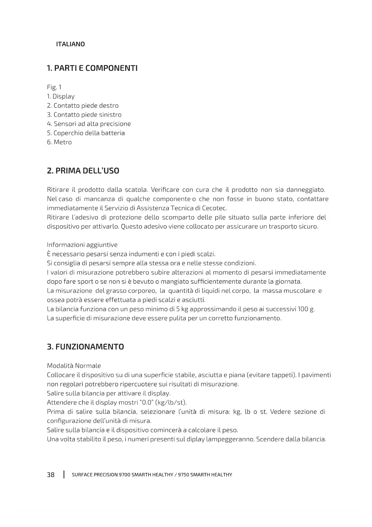 nuovi utenti. Questo dispositivo è stato progettato unicamente per uso personale, non è adatto a ni commerciali. Mantenere il dispositivo e il materiale dell’imballaggio fuori dalla portata di bambini e animali senza supervisione. Non utilizzare il dispositivo se mostra danni visibili. Se il cavo dovesse essere danneggiato, dovrà essere riparato dal Servizio di Assistenza Tecnica ufciale di Cecotec per evitare qualsiasi tipo di pericolo. Mantenere il dispositivo lontano da campi elettromagnetici (Smartphone, telecomandi a distanza. ecc…). Potrebbe ripercuotere sulla precisione della misurazione. Mantenere il dispositivo lontano da fonti di calore. Non utilizzare il prodotto in esterni. Non esporre il dispositivo a temperature estreme, umidità, liquidi e luce solare diretta. Mantenere il dispositivo lontano dall’acqua e da altri liquidi. Cambi drastici di temperatura potrebbero produrre condensa. In tal caso, attendere che il dispositivo ritorni ad una temperatura ambiente prima di metterlo in funzionamento. Evitare di fare cadere il prodotto sul pavimento o saltare sulla supercie di misurazione. Non salire sulla bilancia con i piedi bagnati e vericare che sia la supercie di misurazione che del pavimento siano asciutte. Non collocare i piedi sui bordi della bilancia. Non utilizzare prodotti abrasivi o chimici per pulire il prodotto, potrebbero danneggiare la sua supercie. Questa bilancia è stata progettata per determinare il peso corporeo, analizzare il livello d’acqua e di grasso, massa muscolare e ossea, età corporea, grasso viscerale, metabolismo, condizioni siche e calcolare l’Indice di Massa Corporea (IMC). La funzione di IMC è adatta a calcolare solamente il peso idealeSURFACE PRECISION 9700 SMARTH HEALTHY / 9750 SMARTH HEALTHY
