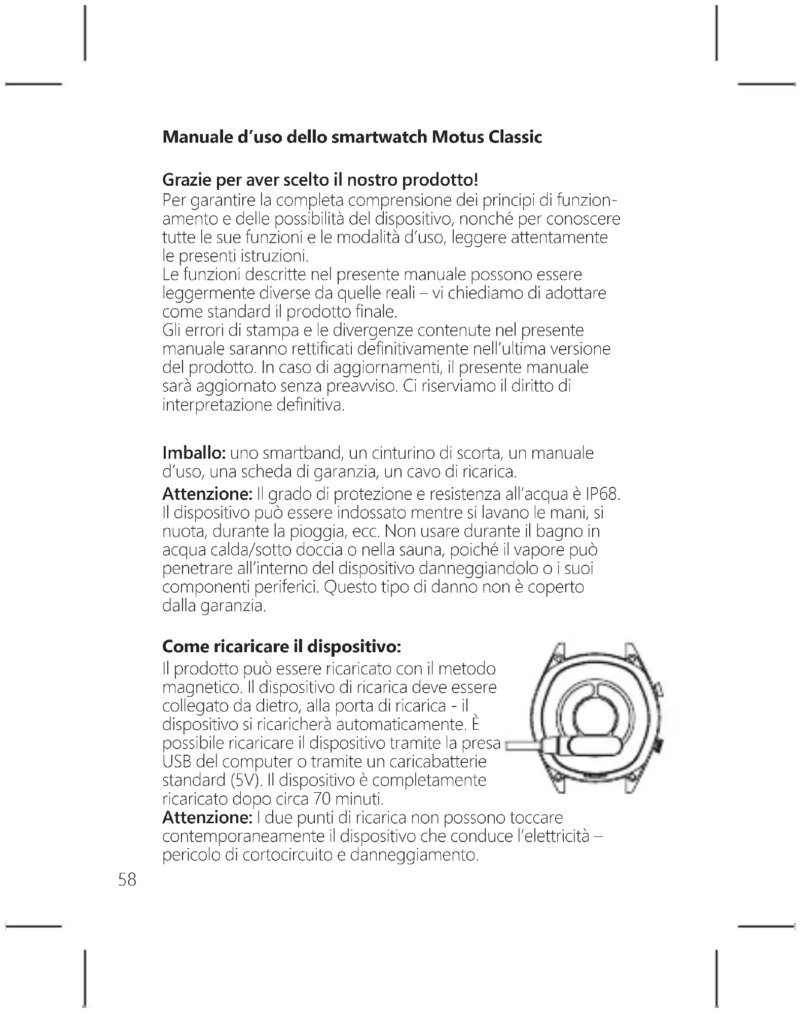 datorio sobre largos períodos de tiempo sentado. Una vez transcurrido el tiempo establecido, se genera un recordatorio de la necesidad de ponerse de pie. Restablecimiento de los ajustes de fábrica: Normalmente, en caso de problema con el software, el restablecimiento de los ajustes de fábrica permite resolverlos; Información sobre el dispositivo: Muestra el modelo del reloj y la versión del software. Transmisión de datos: Es necesario descargar la aplicación Fundo en el teléfono móvil. Una vez establecida la conexión, permite enviar el número de pasos, el pulso, la calidad del sueño y los datos de la actividad deportiva desde el teléfono. ES58 Manuale d’uso dello smartwatch Motus Classic Grazie per aver scelto il nostro prodotto! Per garantire la completa comprensione dei principi di funzion- amento e delle possibilità del dispositivo, nonché per conoscere tutte le sue funzioni e le modalità d’uso, leggere attentamente le presenti istruzioni. Le funzioni descritte nel presente manuale possono essere leggermente diverse da quelle reali – vi chiediamo di adottare come standard il prodotto nale. Gli errori di stampa e le divergenze contenute nel presente manuale saranno retticati denitivamente nell’ultima versione del prodotto. In caso di aggiornamenti, il presente manuale sarà aggiornato senza preavviso. Ci riserviamo il diritto di interpretazione denitiva. Imballo: uno smartband, un cinturino di scorta, un manuale d’uso, una scheda di garanzia, un cavo di ricarica. Attenzione: Il grado di protezione e resistenza all’acqua è IP68. Il dispositivo può essere indossato mentre si lavano le mani, si nuota, durante la pioggia, ecc. Non usare durante il bagno in acqua calda/sotto doccia o nella sauna, poiché il vapore può penetrare all’interno del dispositivo danneggiandolo o i suoi componenti periferici. Questo tipo di danno non è coperto dalla garanzia. Come ricaricare il dispositivo: Il prodotto può essere ricaricato con il metodo magnetico. Il dispositivo di ricarica deve essere collegato da dietro, alla porta di ricarica - il dispositivo si ricaricherà automaticamente. È possibile ricaricare il dispositivo tramite la presa USB del computer o tramite un caricabatterie standard (5V). Il dispositivo è completamente ricaricato dopo circa 70 minuti. Attenzione: I due punti di ricarica non possono toccare contemporaneamente il dispositivo che conduce l’elettricità – pericolo di cortocircuito e danneggiamento.59 Collegare l’orologio al telefonino, scaricare l’applicazione “Fundo” con uno dei seguenti metodi: