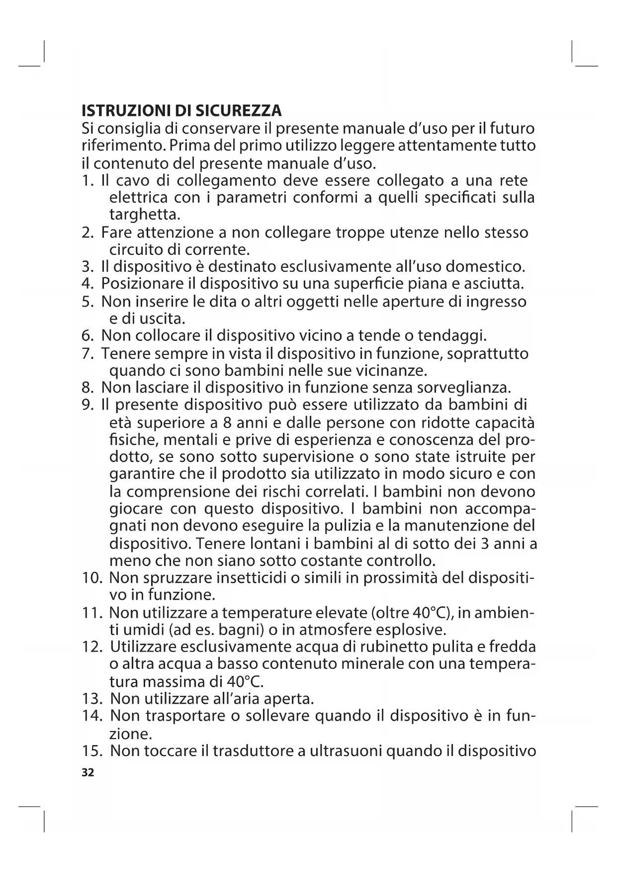 5. Occasionalmente si può formare un deposito all’interno della base o sul trasduttore a ultrasuoni (9), che viene rimosso versando una soluzione di aceto di alcool sui componenti per 30 minuti. Il trasduttore non deve essere toccato con oggetti appuntiti. CONSIGLI PRATICI 1. L’ugello del dispositivo non deve essere rivolto verso la parete. L’umidità che ne fuoriesce può danneggiare la carta da parati, ecc. 2. L’umidità eccessiva nell’ambiente può causare condensa su vetri e mobili. In questo caso, l’umidicatore deve essere spento.