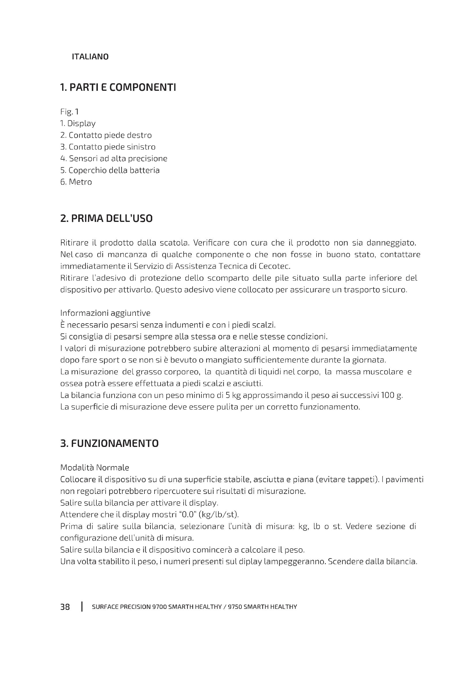 nuovi utenti. Questo dispositivo è stato progettato unicamente per uso personale, non è adatto a ni commerciali. Mantenere il dispositivo e il materiale dell’imballaggio fuori dalla portata di bambini e animali senza supervisione. Non utilizzare il dispositivo se mostra danni visibili. Se il cavo dovesse essere danneggiato, dovrà essere riparato dal Servizio di Assistenza Tecnica ufciale di Cecotec per evitare qualsiasi tipo di pericolo. Mantenere il dispositivo lontano da campi elettromagnetici (Smartphone, telecomandi a distanza. ecc…). Potrebbe ripercuotere sulla precisione della misurazione. Mantenere il dispositivo lontano da fonti di calore. Non utilizzare il prodotto in esterni. Non esporre il dispositivo a temperature estreme, umidità, liquidi e luce solare diretta. Mantenere il dispositivo lontano dall’acqua e da altri liquidi. Cambi drastici di temperatura potrebbero produrre condensa. In tal caso, attendere che il dispositivo ritorni ad una temperatura ambiente prima di metterlo in funzionamento. Evitare di fare cadere il prodotto sul pavimento o saltare sulla supercie di misurazione. Non salire sulla bilancia con i piedi bagnati e vericare che sia la supercie di misurazione che del pavimento siano asciutte. Non collocare i piedi sui bordi della bilancia. Non utilizzare prodotti abrasivi o chimici per pulire il prodotto, potrebbero danneggiare la sua supercie. Questa bilancia è stata progettata per determinare il peso corporeo, analizzare il livello d’acqua e di grasso, massa muscolare e ossea, età corporea, grasso viscerale, metabolismo, condizioni siche e calcolare l’Indice di Massa Corporea (IMC). La funzione di IMC è adatta a calcolare solamente il peso idealeSURFACE PRECISION 9700 SMARTH HEALTHY / 9750 SMARTH HEALTHY