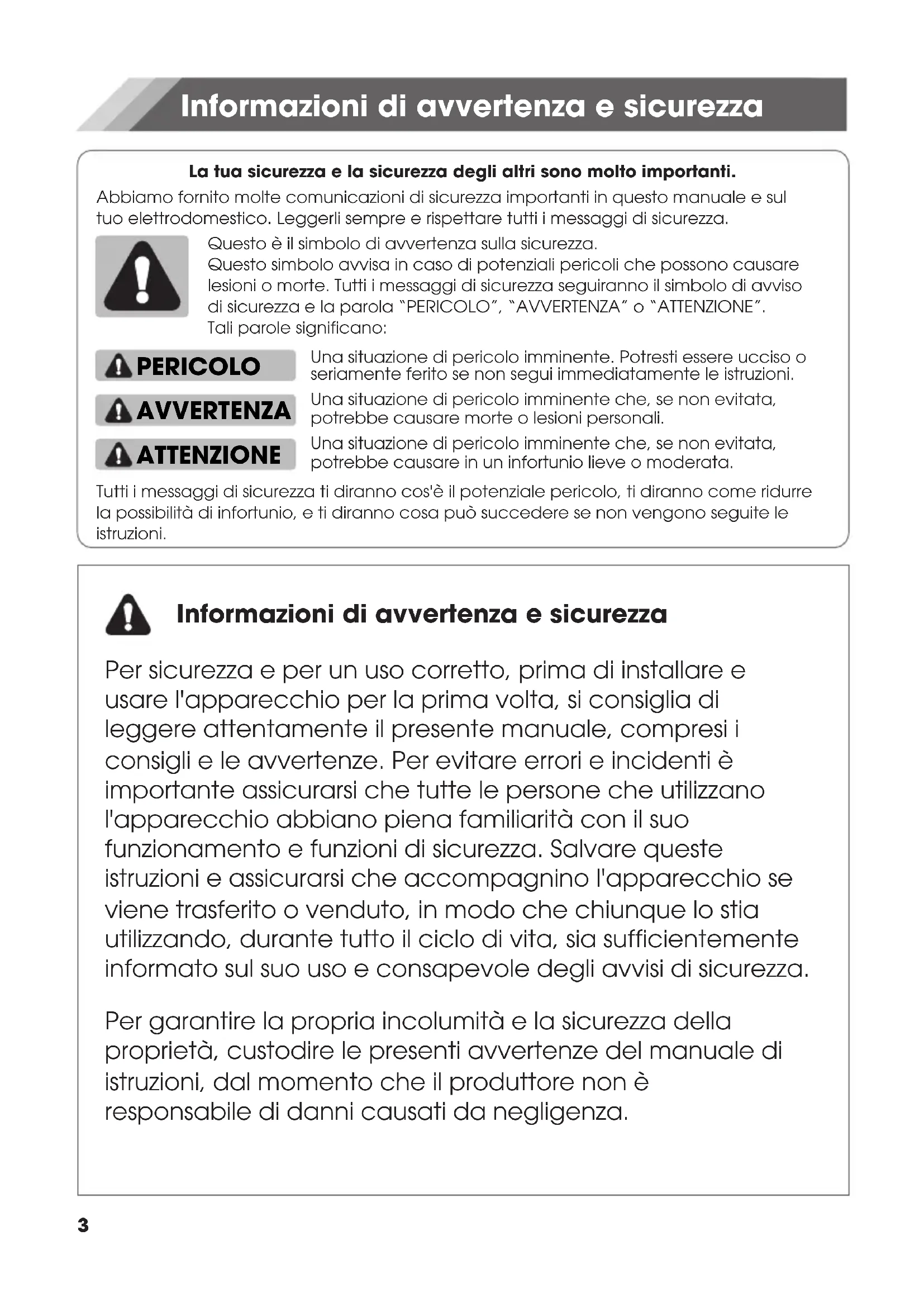 30La tua sicurezza e la sicurezza degli altri sono molto importanti. PERICOLO AVVERTENZA ATTENZIONE Informazioni di avvertenza e sicurezza Informazioni di avvertenza e sicurezza Per sicurezza e per un uso corretto, prima di installare e usare l'apparecchio per la prima volta, si consiglia di leggere attentamente il presente manuale, compresi i consigli e le avvertenze. Per evitare errori e incidenti è importante assicurarsi che tutte le persone che utilizzano