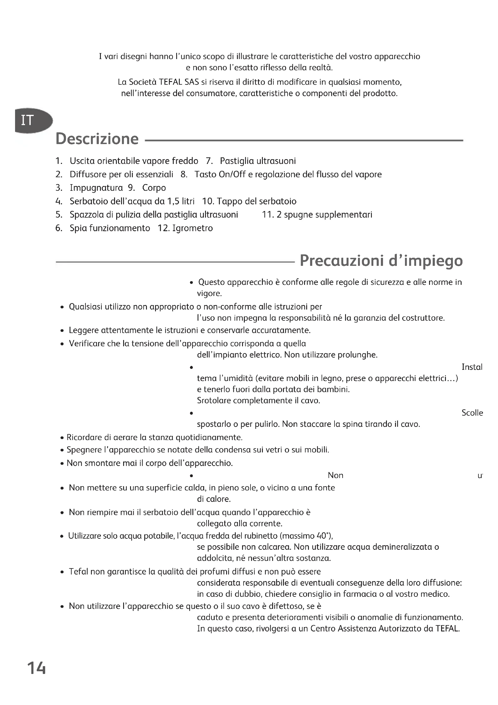 - Tefal non garantisce la qualità dei profumi diffusi e non può essere considerata responsabile di eventuali conseguenze della loro diffusione: in caso di dubbio, chiedere consiglio in farmacia o al vostro medico.